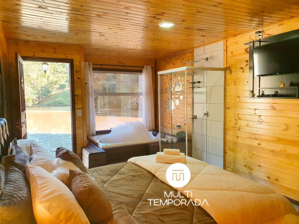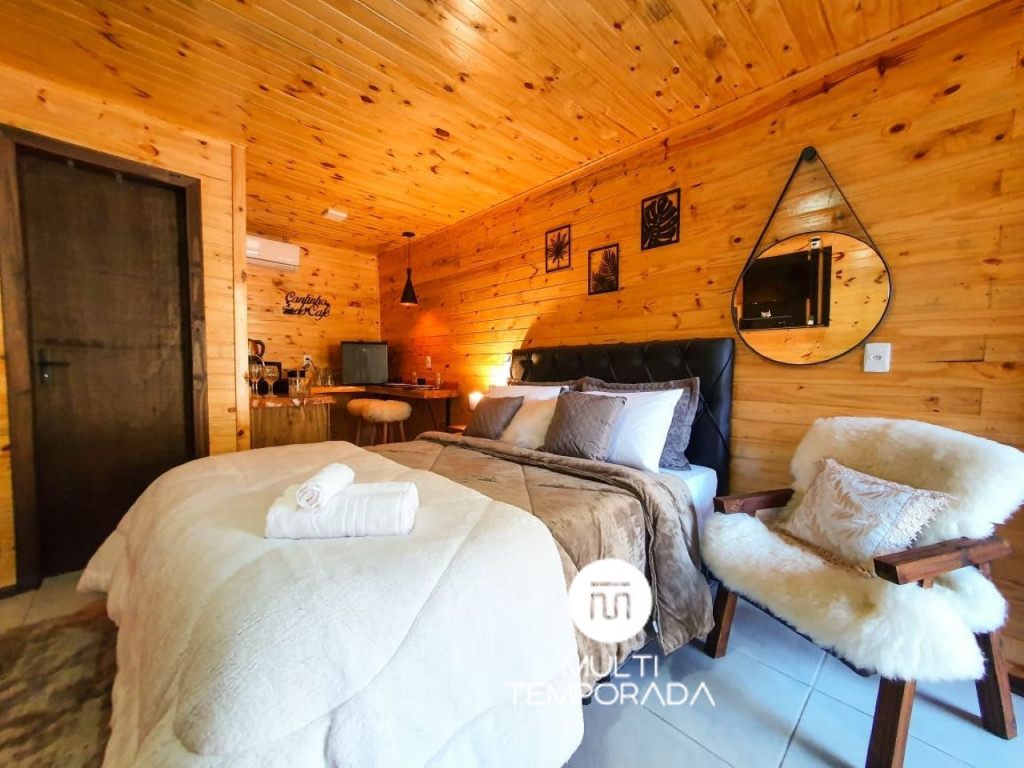 Oferecemos estacionamento amplo, lago e uma linda vista. O espaço interno possui 25m² e conta com: banheira de hidromassagem com cromoterapia, chuveiro e torneiras com aquecimento a gás, ambiente todo climatizado com ar-condicionado quente e frio e uma vista maravilhosa da natureza, bem como da lagoa. A cozinha é compacta e possui: frigobar, micro-ondas, cafeteira dolce gusto, chaleira elétrica, louças e talheres e itens básicos de cozinha. Além disso, temos internet WI-FI de 400 mega, TV Smart 32’’, Sky, rouparia de cama completa com cobertores e travesseiros, rouparia de banho (toalhas e roupões), secador de cabelo e tudo o que há de melhor para sua hospedagem. Tudo isso para um melhor conforto dos nossos hóspedes, para que se sintam em casa, em um perfeito refúgio para descansar e desvendar o que há de melhor na Serra Catarinense.
