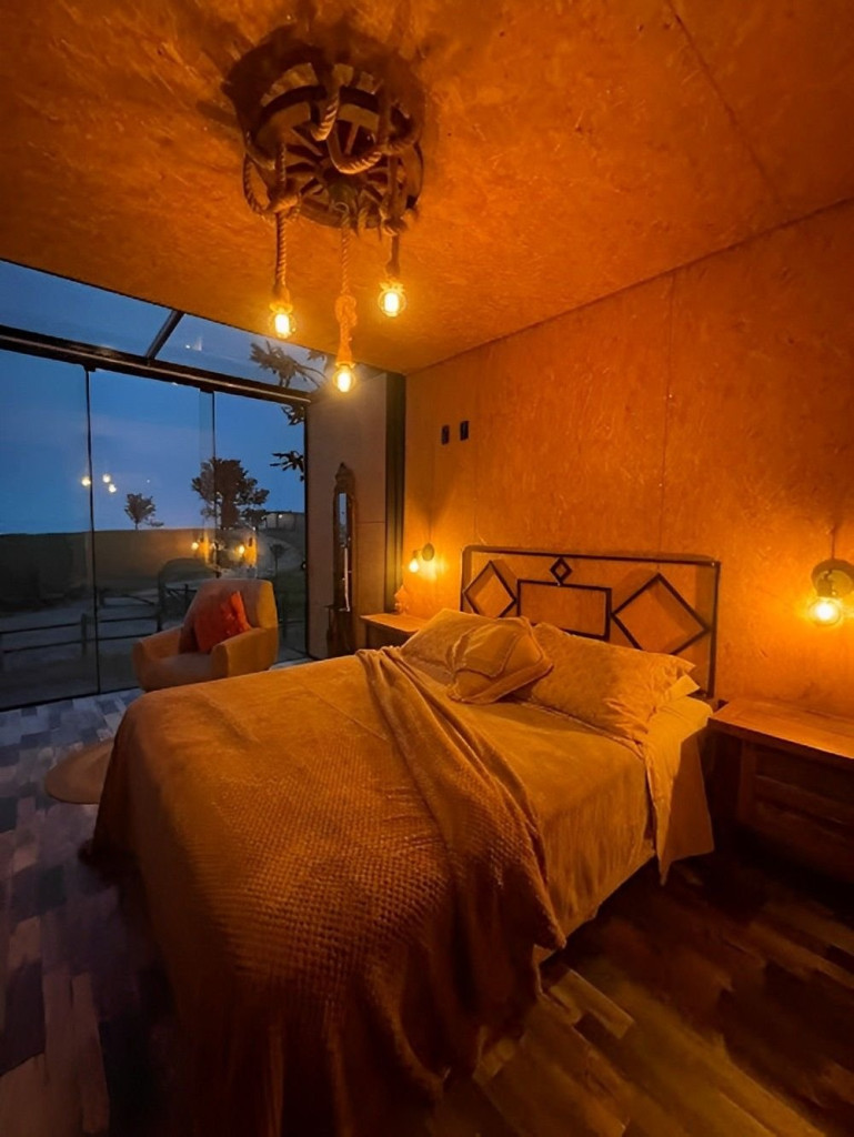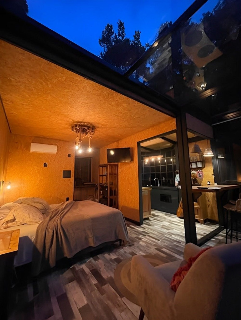- Cama casal queen - Lençol térmico - Ar condicionado - Calefator - Duas banheiras de imersão individuais com aquecimento a lenha Cozinha equipada:- frigobar - fogão cooktop 2 bocas - forno elétrico - microondas - utensílios/louças/talheres - aparelho de foundueEsta incluso na diária box de café da manhã.