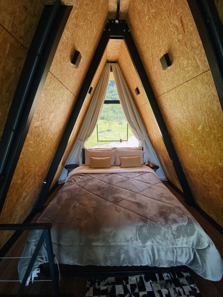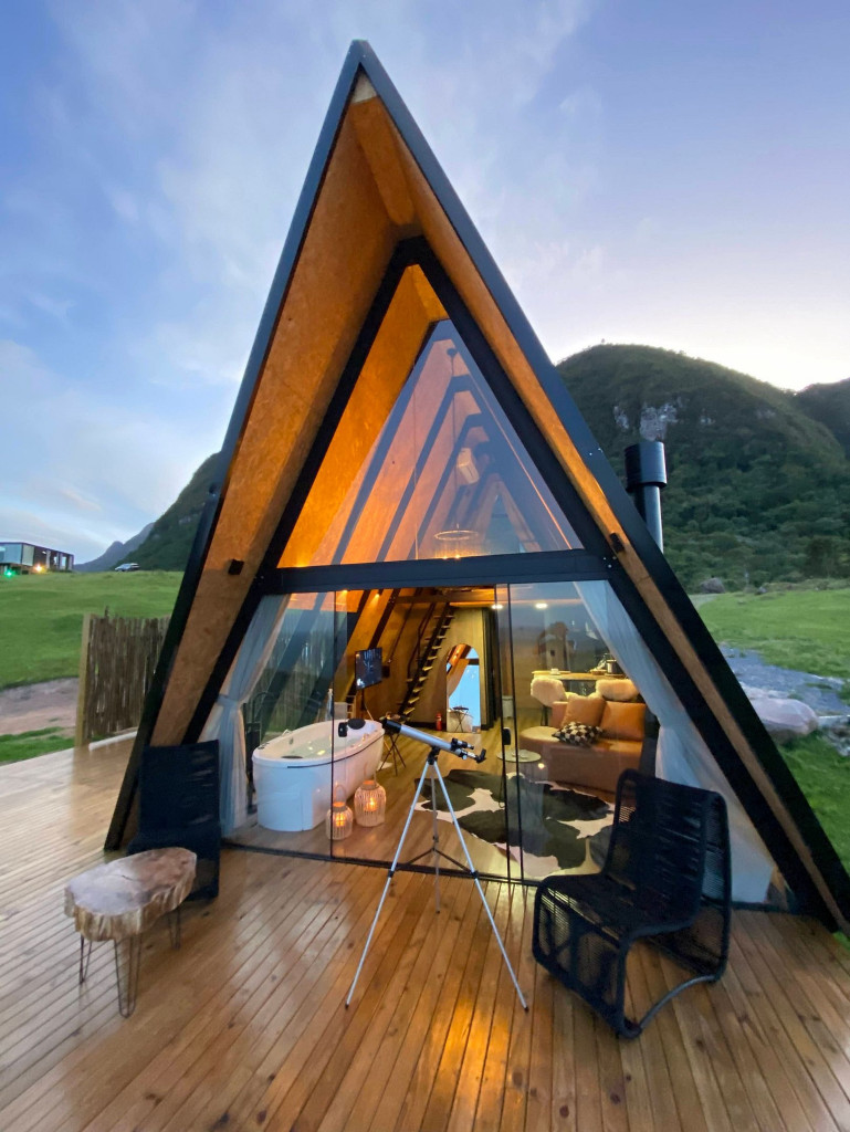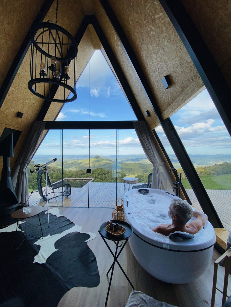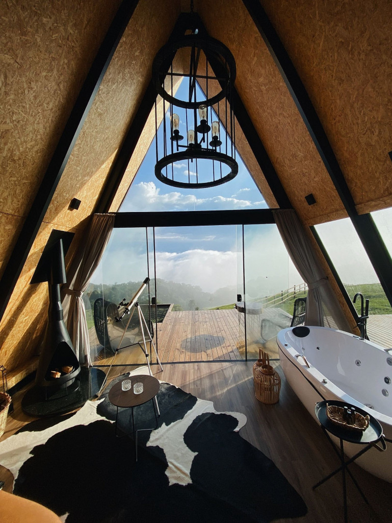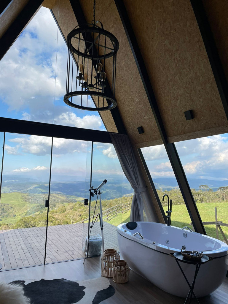 A Cabana Horizonte foi desenvolvida para casais e pensada em cada detalhe para oferecer momentos de conforto e aconchego a dois.Com todo o charme que uma cabana Aframe remete e uma banheira de hidromassagem com cromoterapia na sala com uma vista deslumbrante.