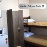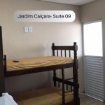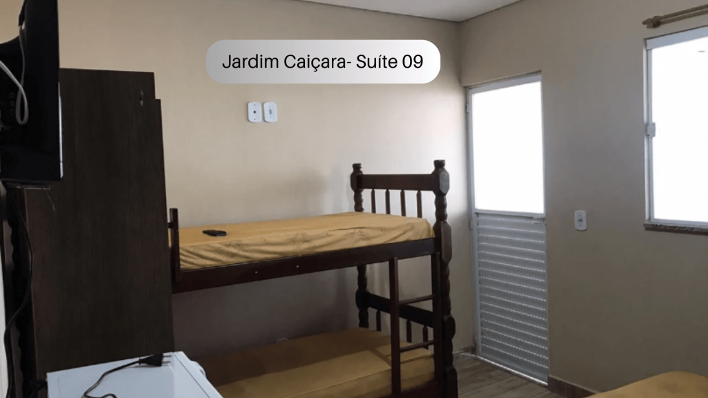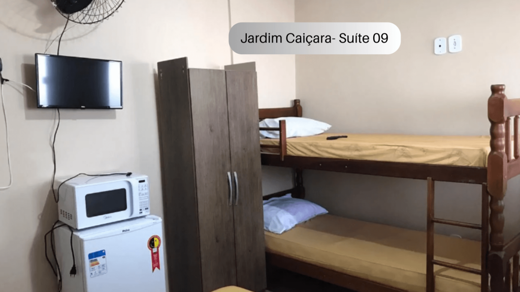 Suíte (quarto e banheiro) privativa. O imóvel possui uma cama casal e um beliche, frigobar, forno micro-ondas, ventilador e TV. Comporta, somente, 4 pessoas. O imóvel fica no terceiro andar, sendo necessário subir escada. Possui janela com vista para o corredor. O endereço da hospedagem é: Rua Frei Henrique Coimbra, 158, Jardim Caiçara - Cabo Frio - RJ. (Ponto de Referência: em frente à Delegacia de Polícia Civil). Região com comércio. É exigida identificação pessoal. Wi-Fi disponível