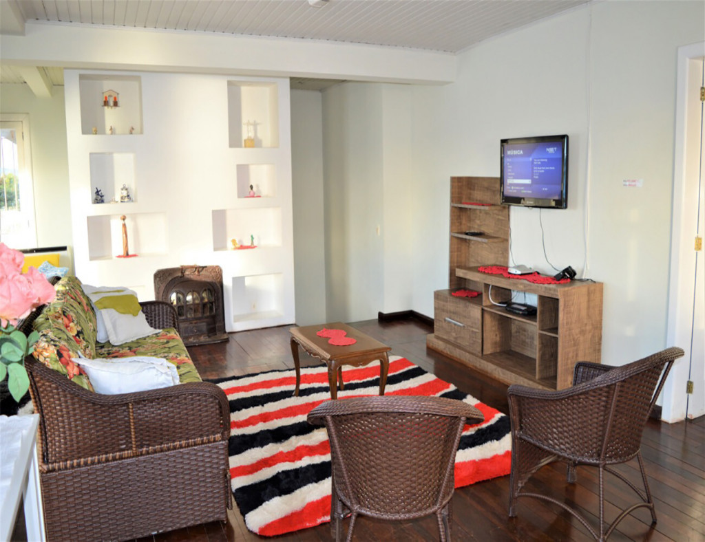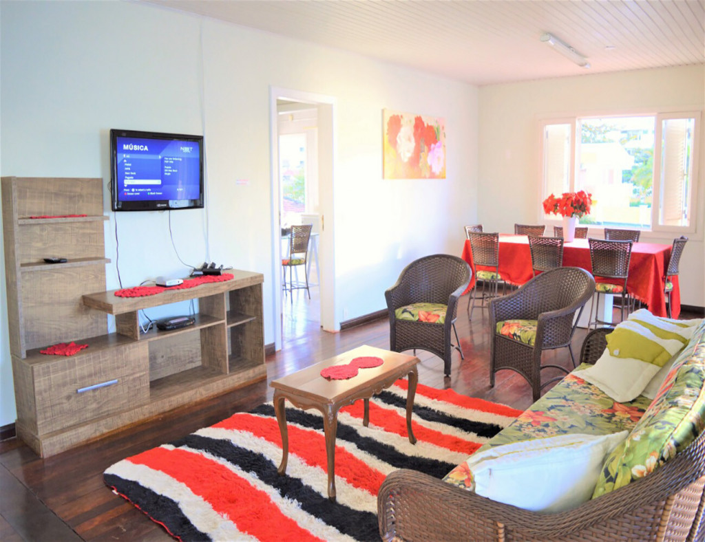 Possui ampla sala de convivência, sala de jantar, espaço para refeições, churrasqueira na área externa e extensas varandas. Sua cozinha totalmente equipada e conta também com lavanderia.