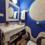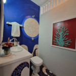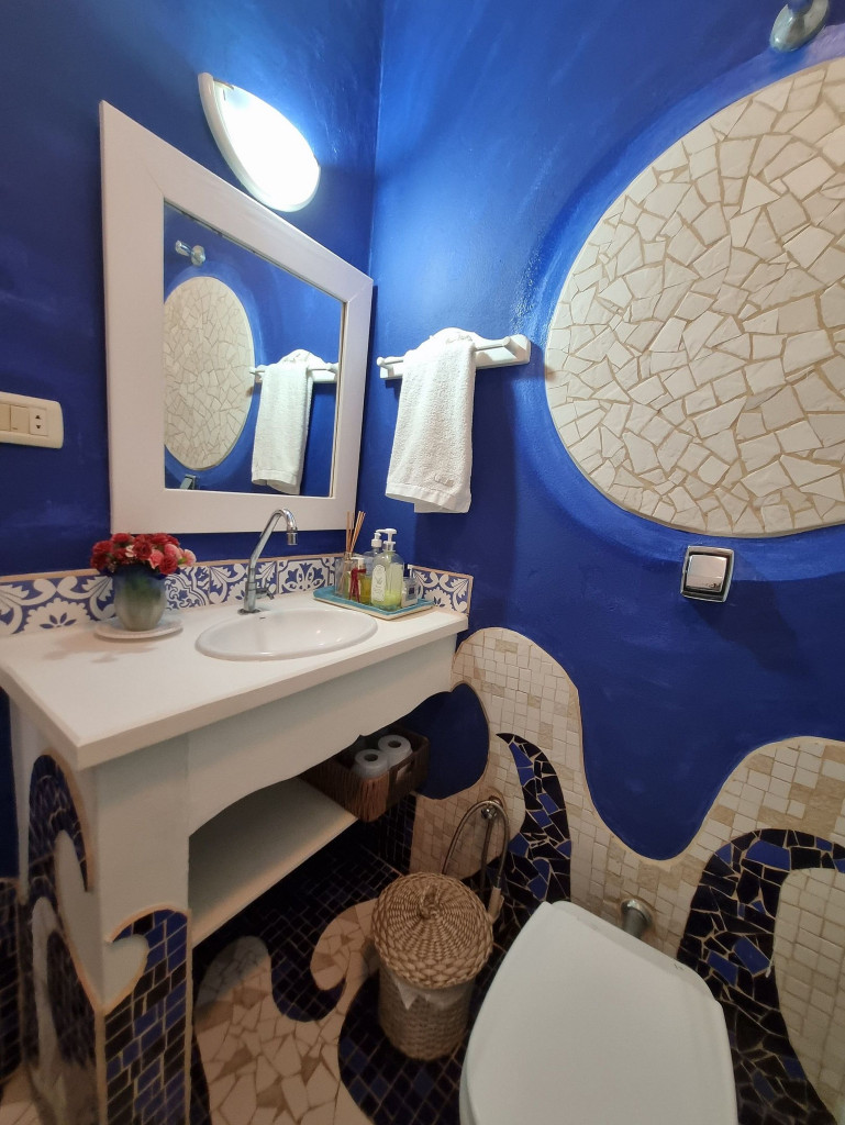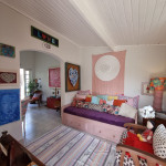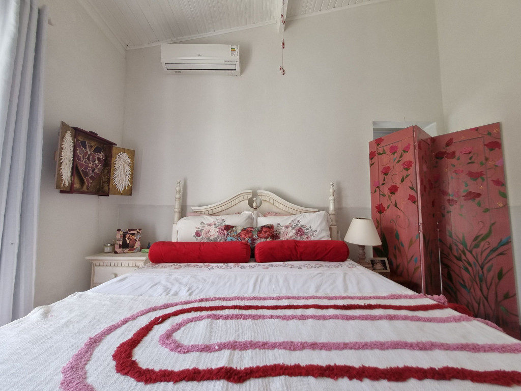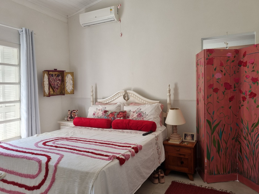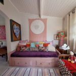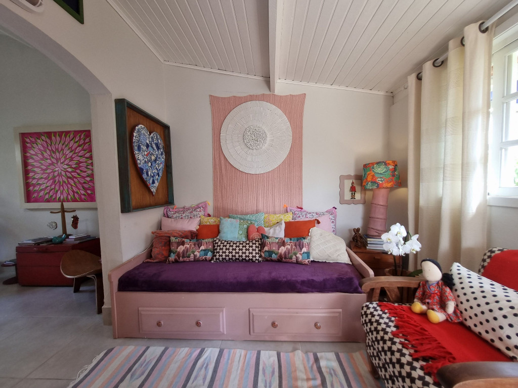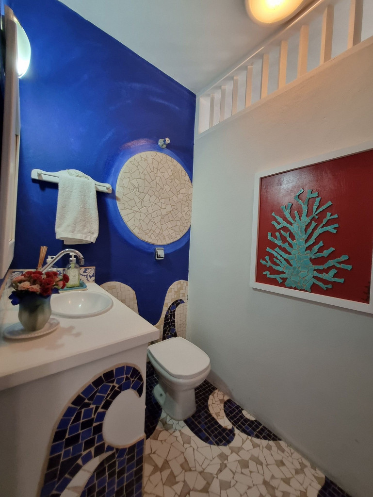 No corredor há um lavabo inteiramente feito pela artista e em seguida a suíte com cama queen, TV smart e uma varanda com rede que dá acesso para a parte externa da casa.