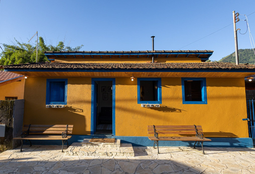 Além ser muito bem equipada com lareira interna, cozinha completa e camas confortáveis, conta com quintal amplo, área para refeições, redes para descanso e área de fogueira.