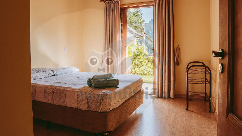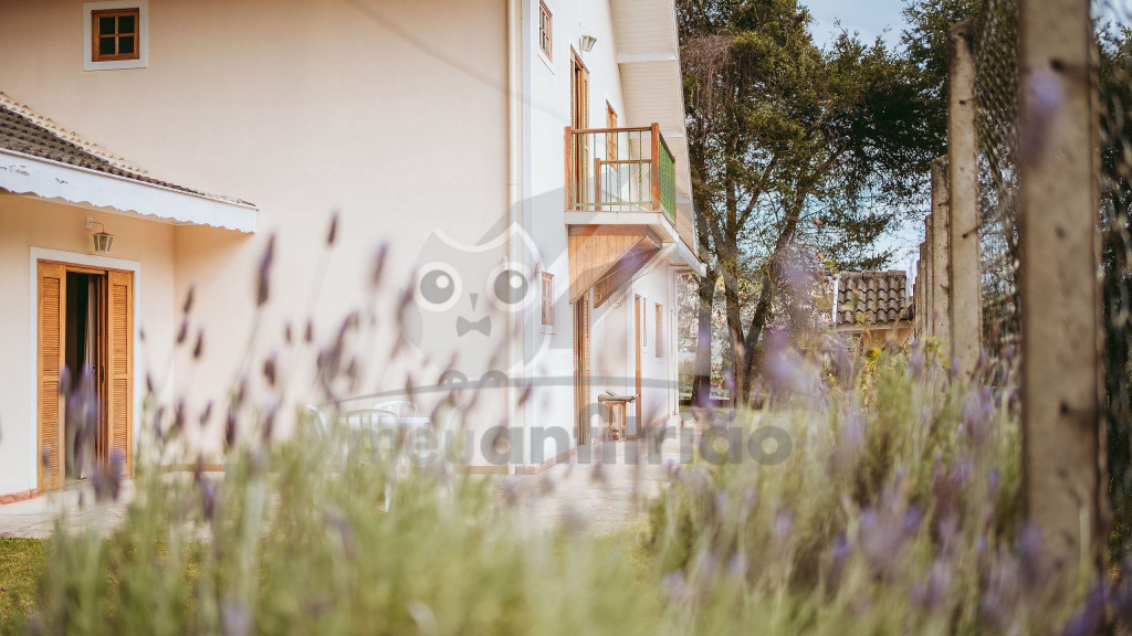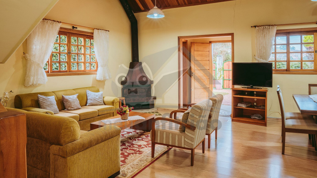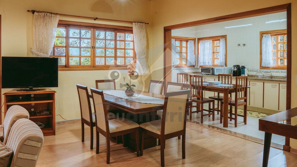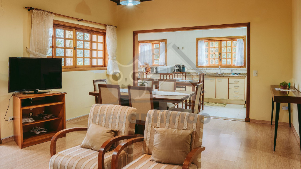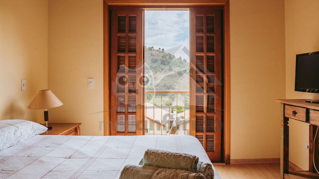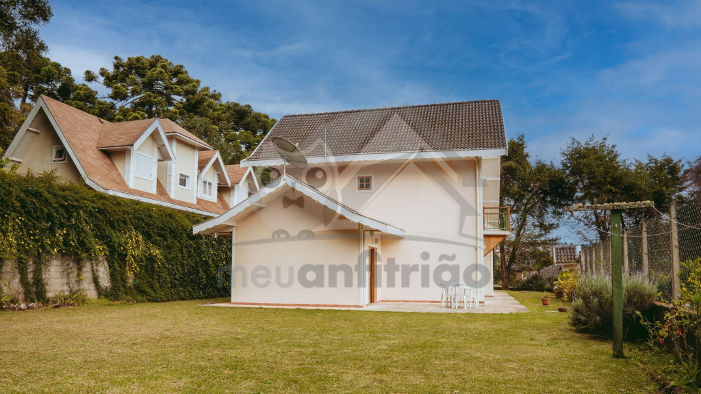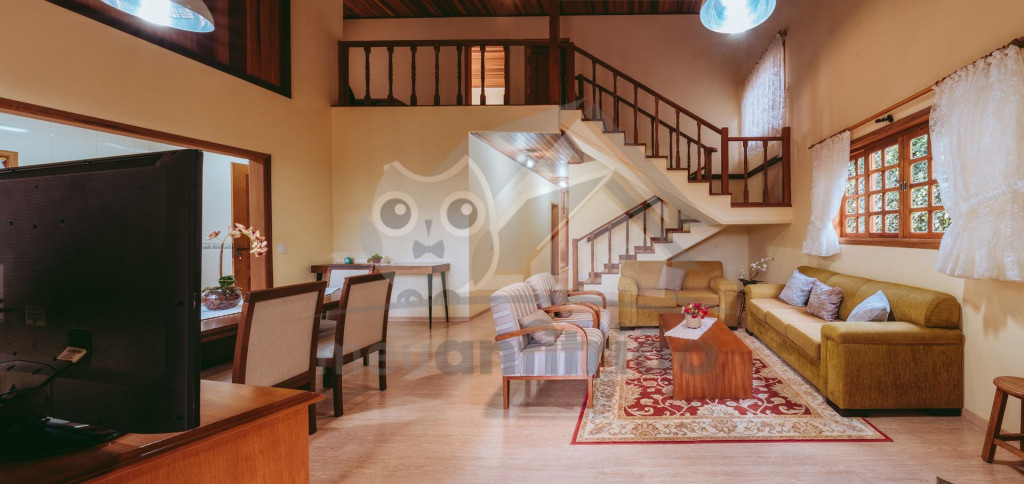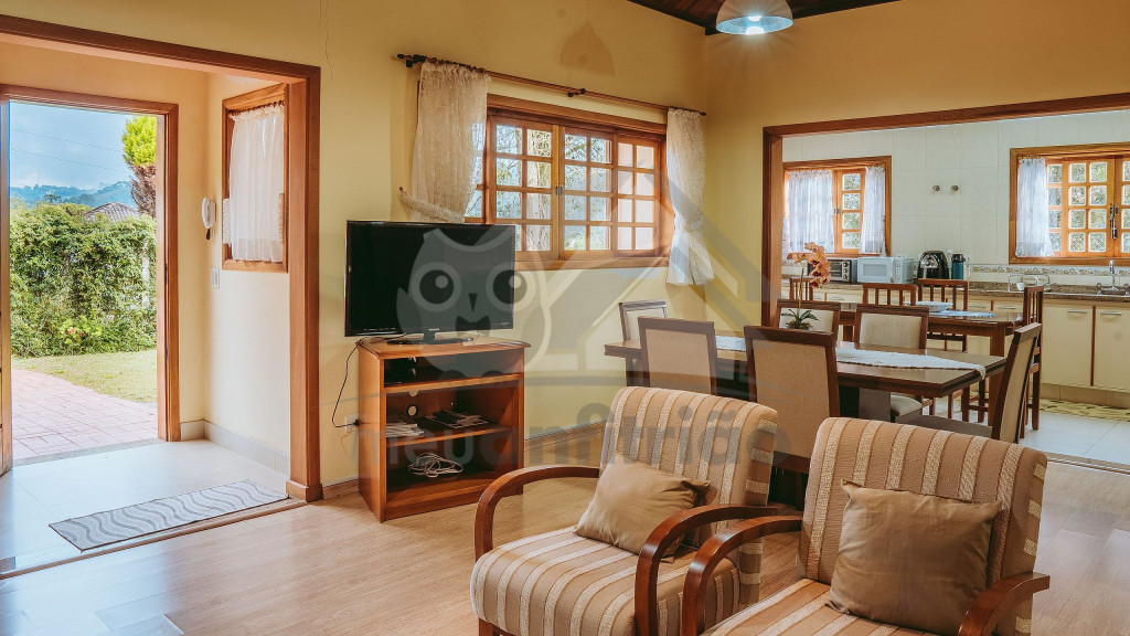 Ao entrar pela porta principal, os hóspedes terão acesso a uma ampla sala de estar com TV, lareira, poltronas e sofás. Ao lado, em conceito aberto, temos uma cozinha completa com todos os utensílios necessários para a estadia, uma sala de jantar com mesa e cadeiras, e um lavabo.A casa conta com 5 quartos, sendo: 2 suítes com porta para a área externa e 1 quarto duplo, no piso térreo, e outras 2 suítes no piso superior com sacada e vista.Na área externa, disponibilizamos de um amplo jardim e gramado. A garagem fica dentro do imóvel e comporta até diversos carros parados em fila.