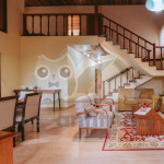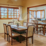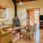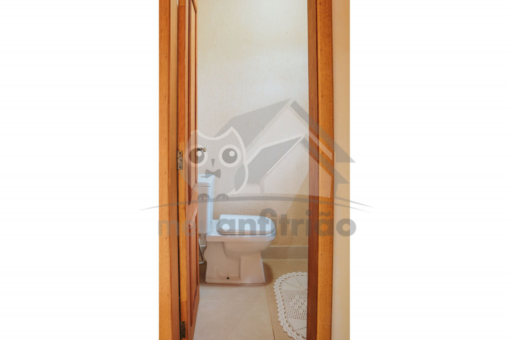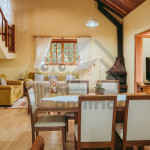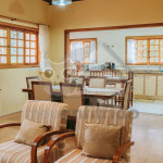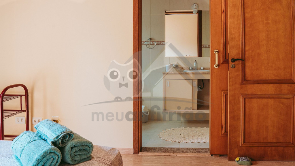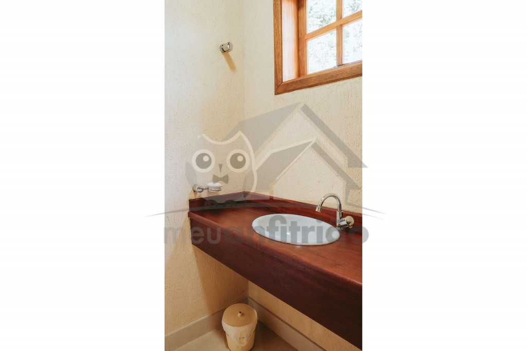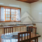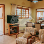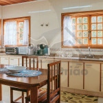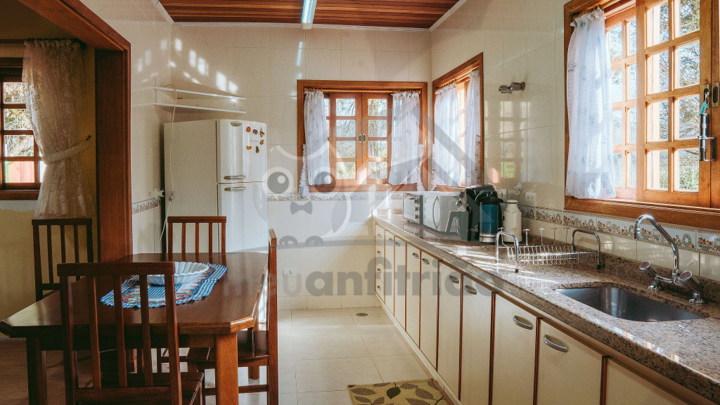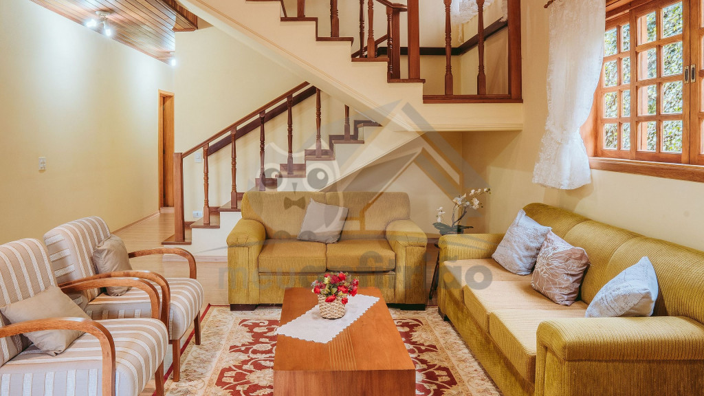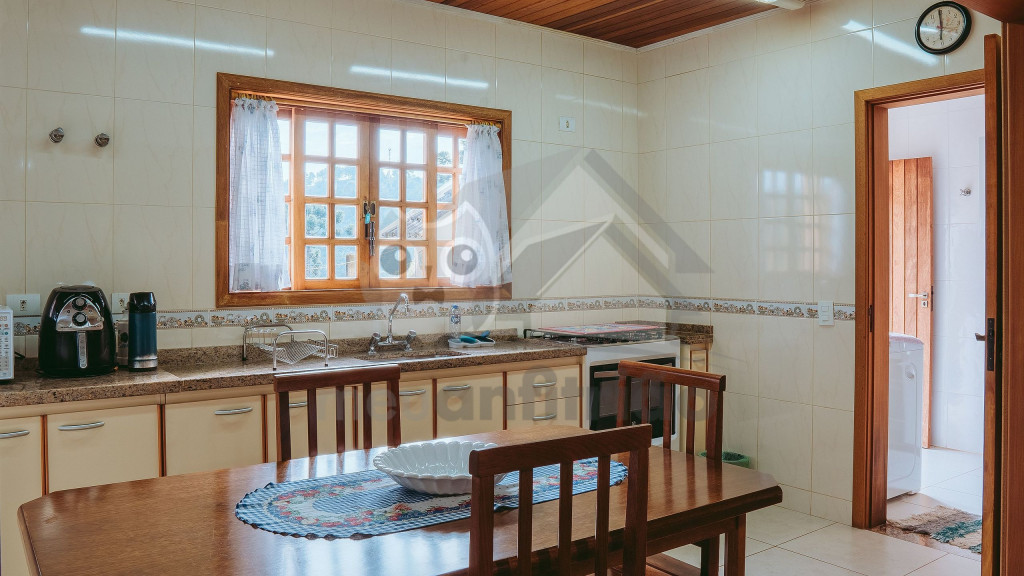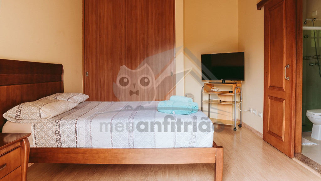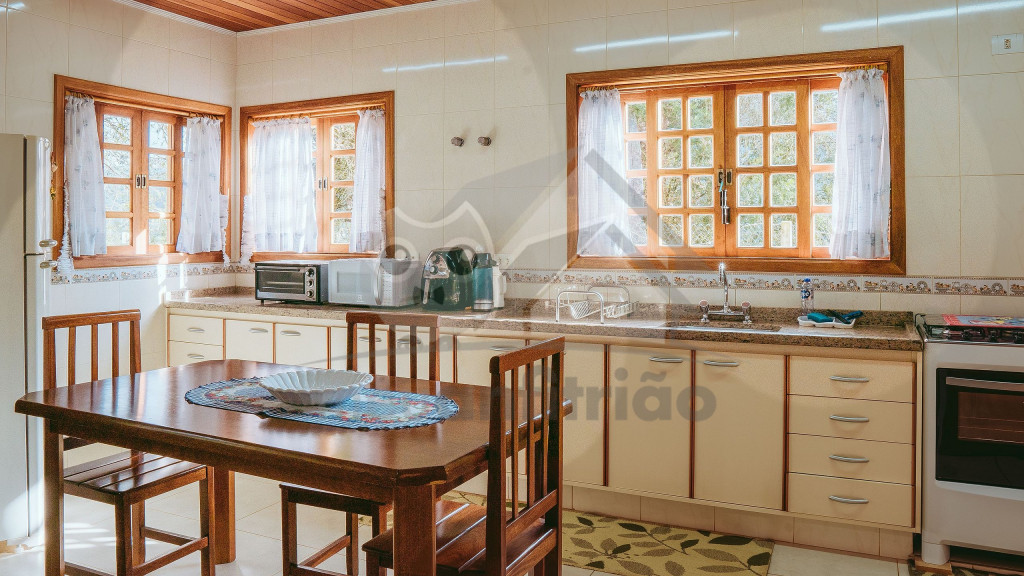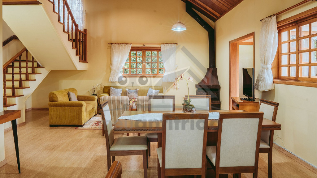 Ao entrar pela porta principal, os hóspedes terão acesso a uma ampla sala de estar com TV, lareira, poltronas e sofás. Ao lado, em conceito aberto, temos uma cozinha completa com todos os utensílios necessários para a estadia, uma sala de jantar com mesa e cadeiras, e um lavabo.A casa conta com 5 quartos, sendo: 2 suítes com porta para a área externa e 1 quarto duplo, no piso térreo, e outras 2 suítes no piso superior com sacada e vista.Na área externa, disponibilizamos de um amplo jardim e gramado. A garagem fica dentro do imóvel e comporta até diversos carros parados em fila.