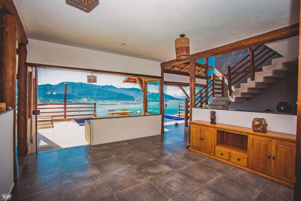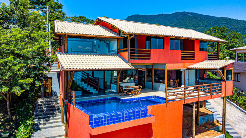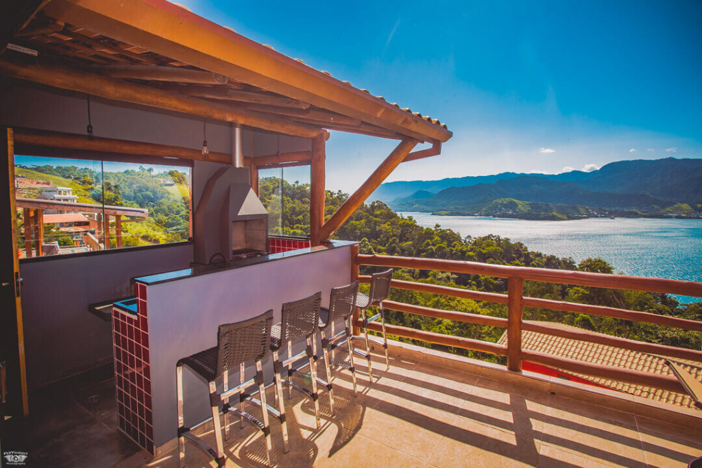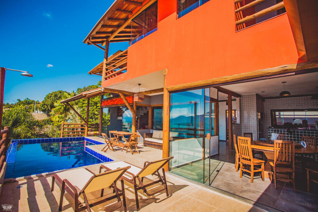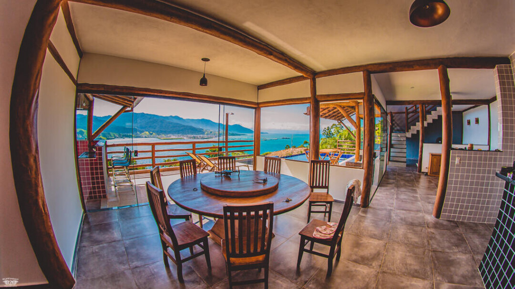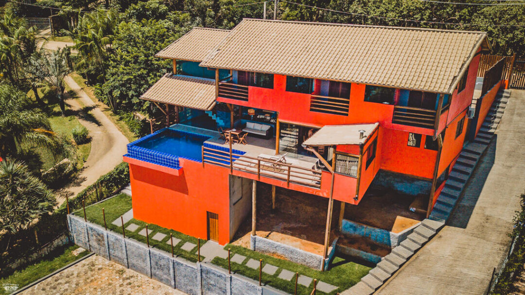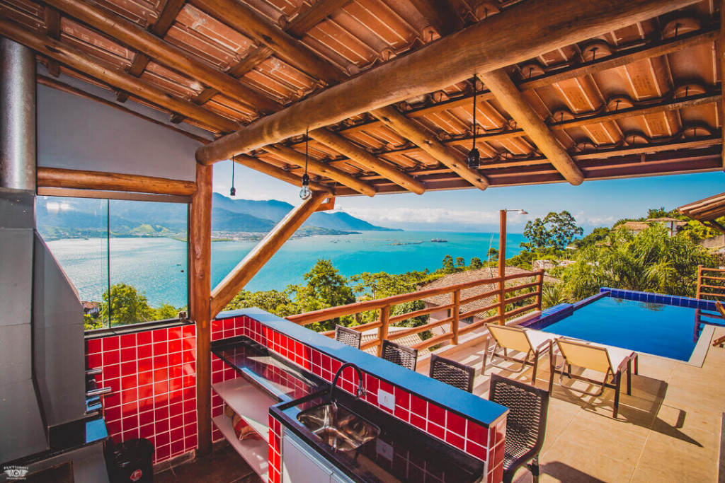 No andar de baixo estão a sala, cozinha totalmente equipada, piscina com borda infinita e churrasqueira. Os hóspedes da casa ainda têm estacionamento privativo e Wi-Fi de 40 Mbps.