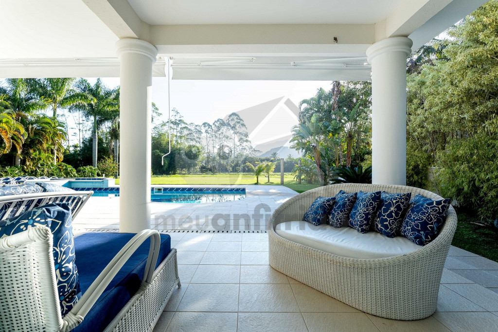 A área externa é o ponto alto da casa e conta com piscina , jacuzzi, jardim espaçoso, espreguiçadeiras e varanda gourmet com churrasqueira, forno de pizza, mesas e sofás.