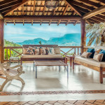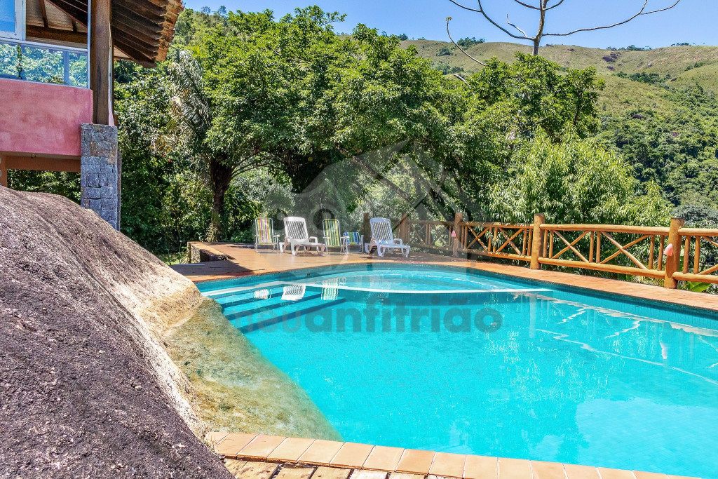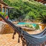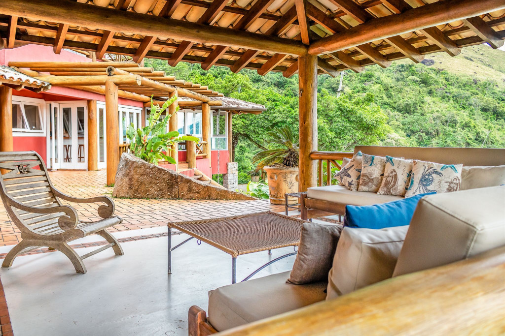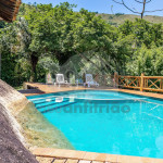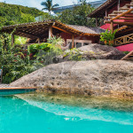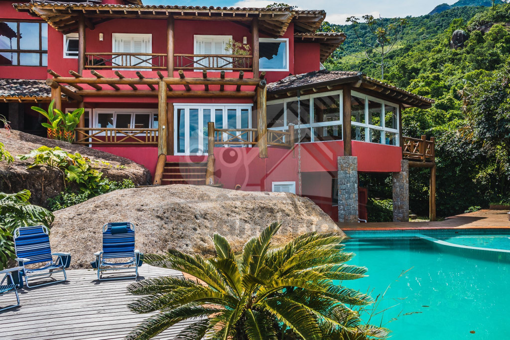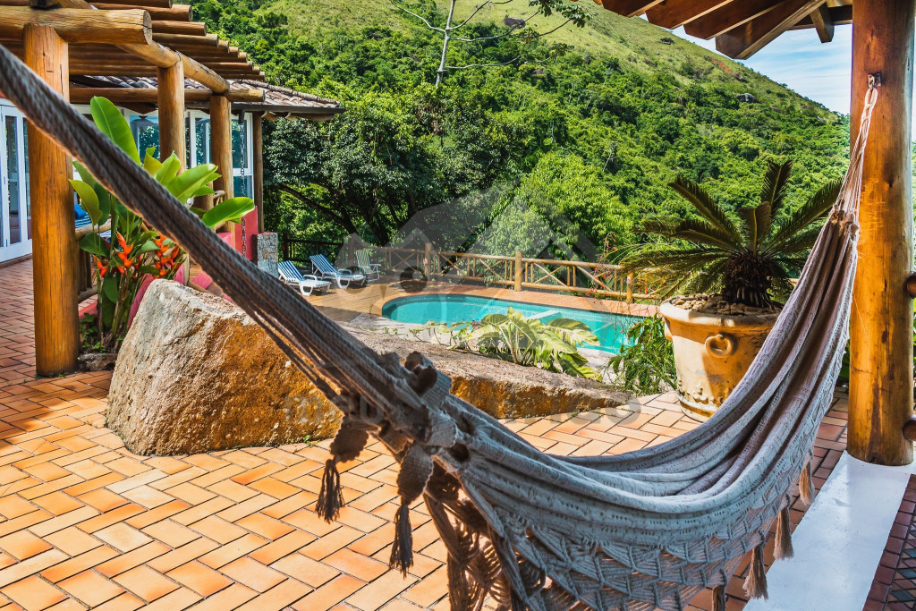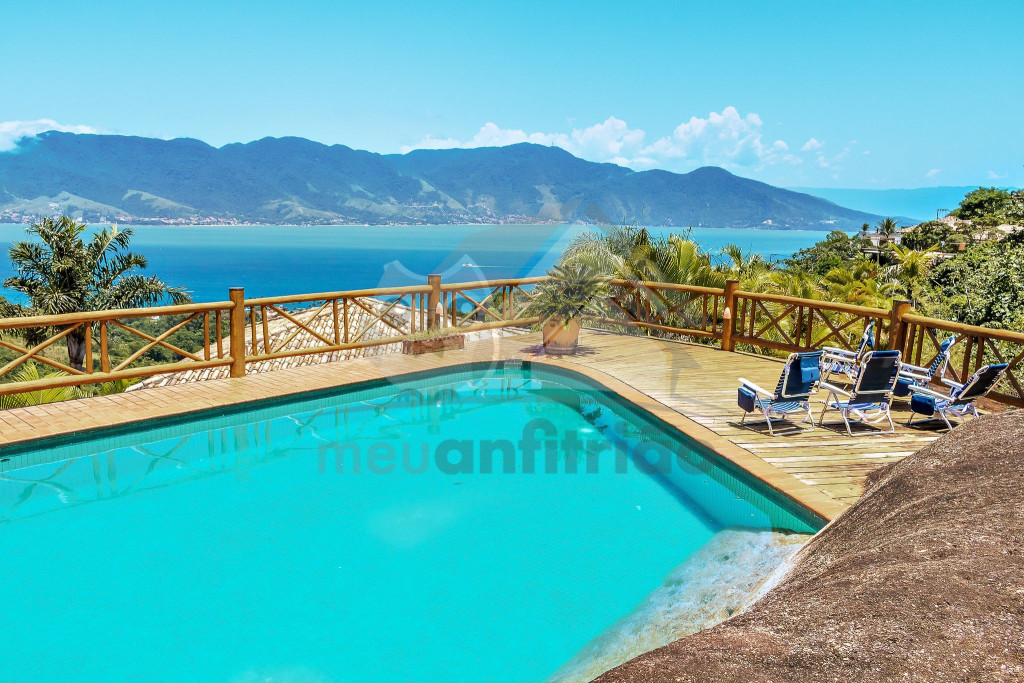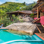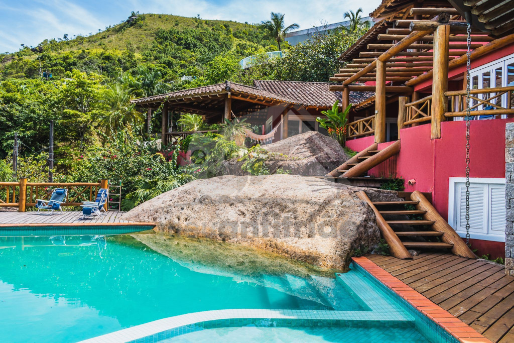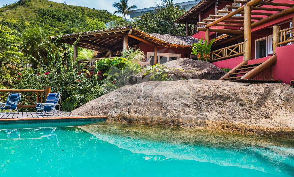Descendo algumas escadas, é possível acessar um deck com piscina construída em volta de uma pedra natural. O espaço conta espreguiçadeiras e sauna úmida com chuveiro. Tem linda vista para o canal da Ilhabela.