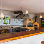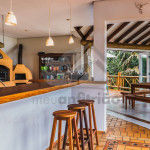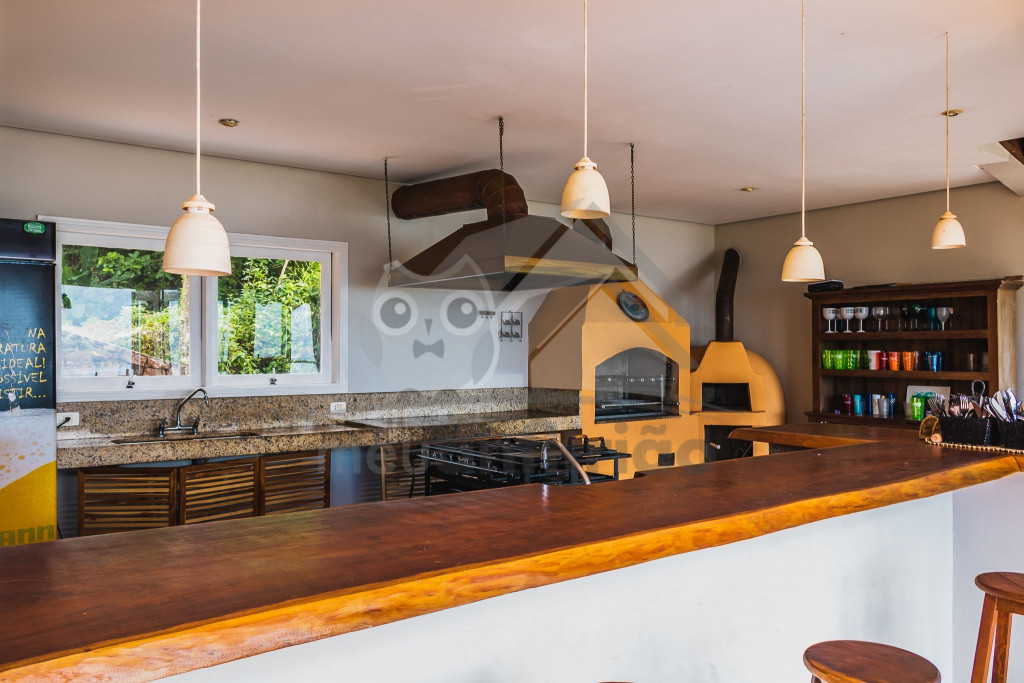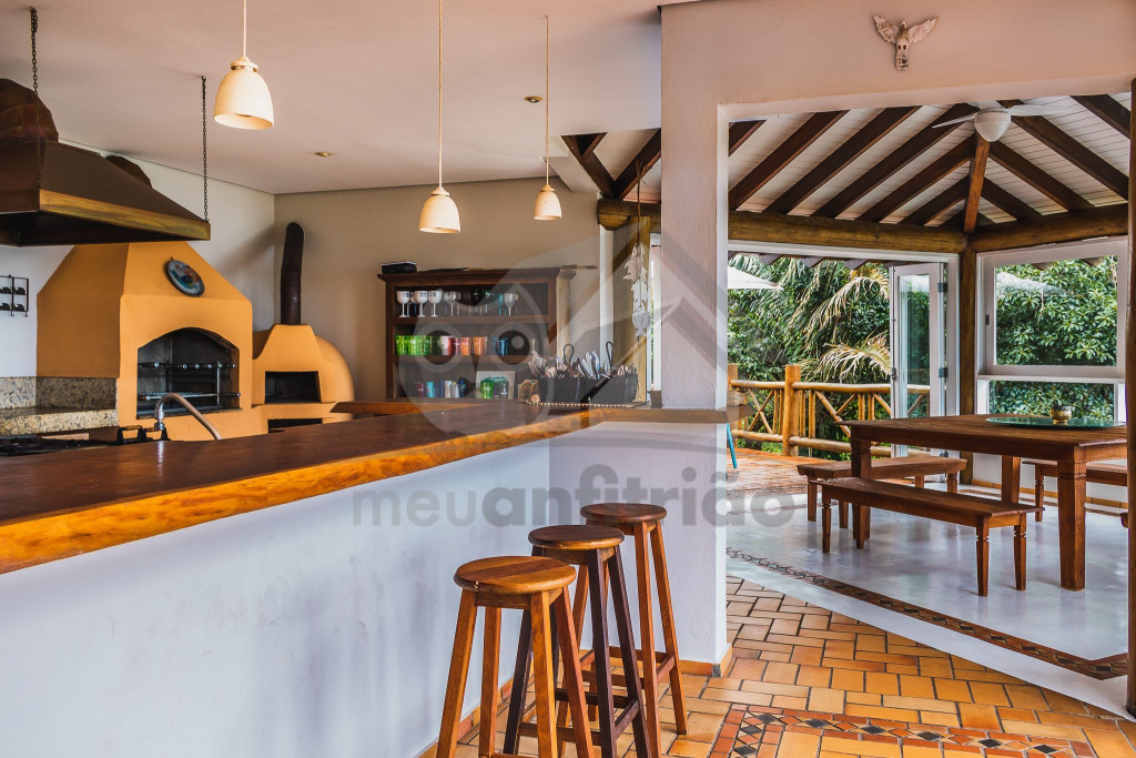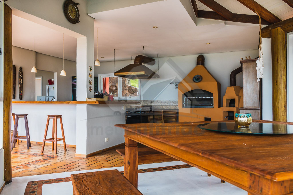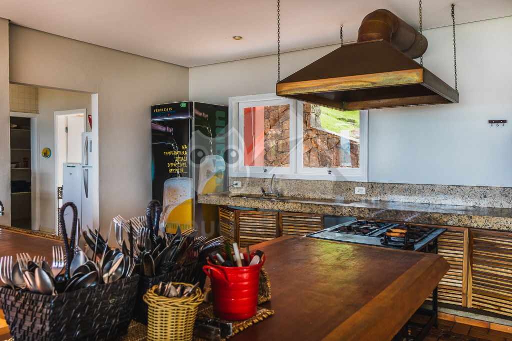 Ao chegar na casa pela garagem, é necessário subir alguns lances de escada. Após subir, os hóspedes chegarão à área externa da casa, que conta com: lounge com sofás, sala de TV com lareira, área gourmet com freezer vertical, forno de pizza, fogão industrial e churrasqueira, sala de jantar, além de uma cozinha completa com todos os utensílios necessários para a estadia.