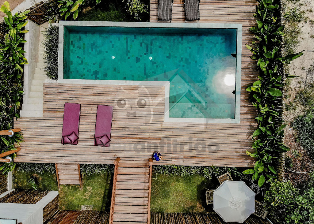 Descendo as escadas, temos um deck com piscina, espreguiçadeiras, chuveirão e uma mesinha com guarda-sol. Também dispomos de uma churrasqueira portátil.