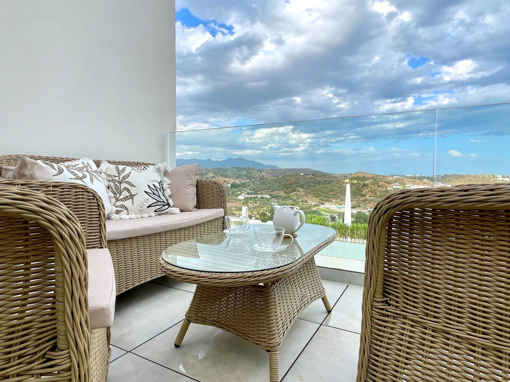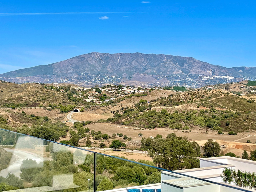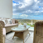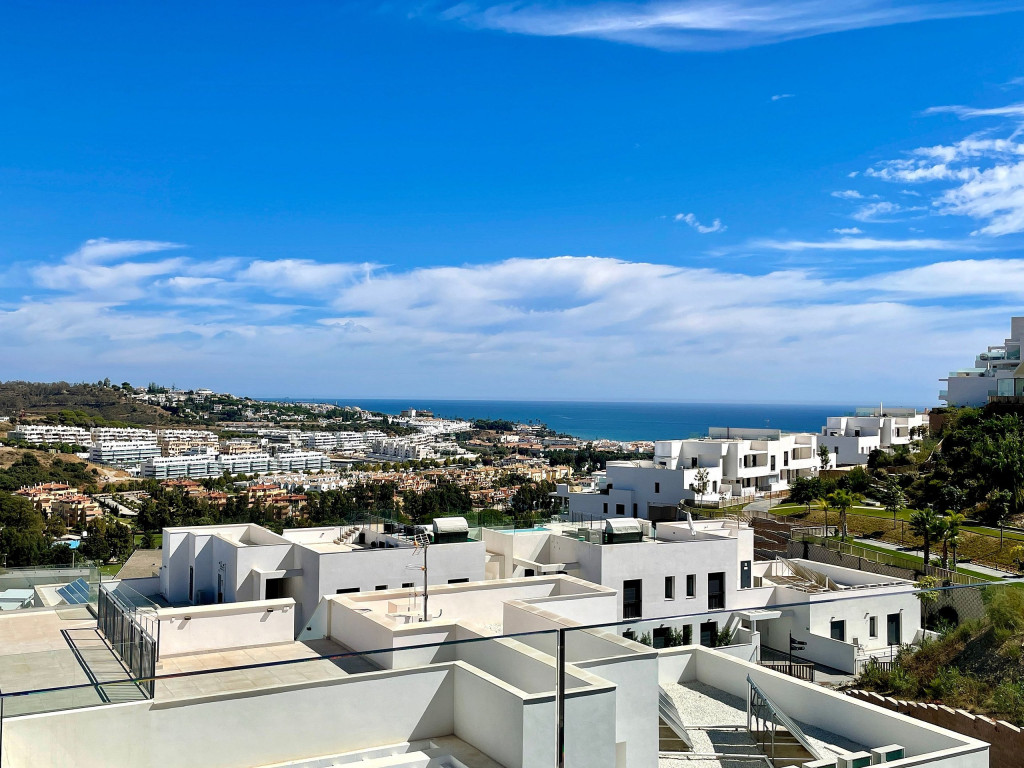 Uma casa de temporada projetada com bom gosto, com acesso ao terraço do quarto principal e da sala de estar. Vista mar e vista montanha, bem como vista para a aldeia La Cala de Mijas.
