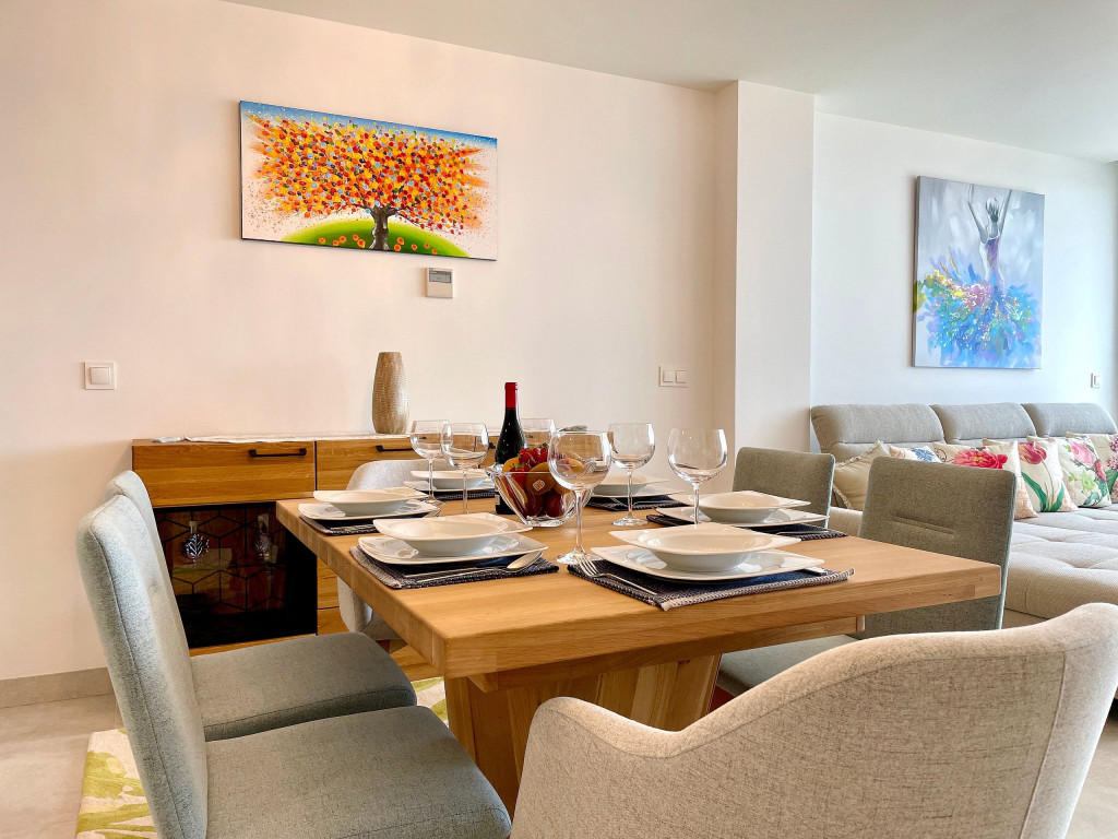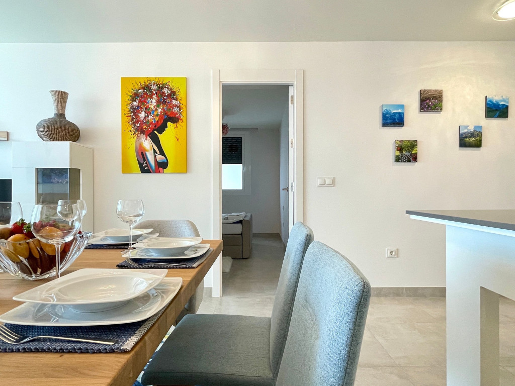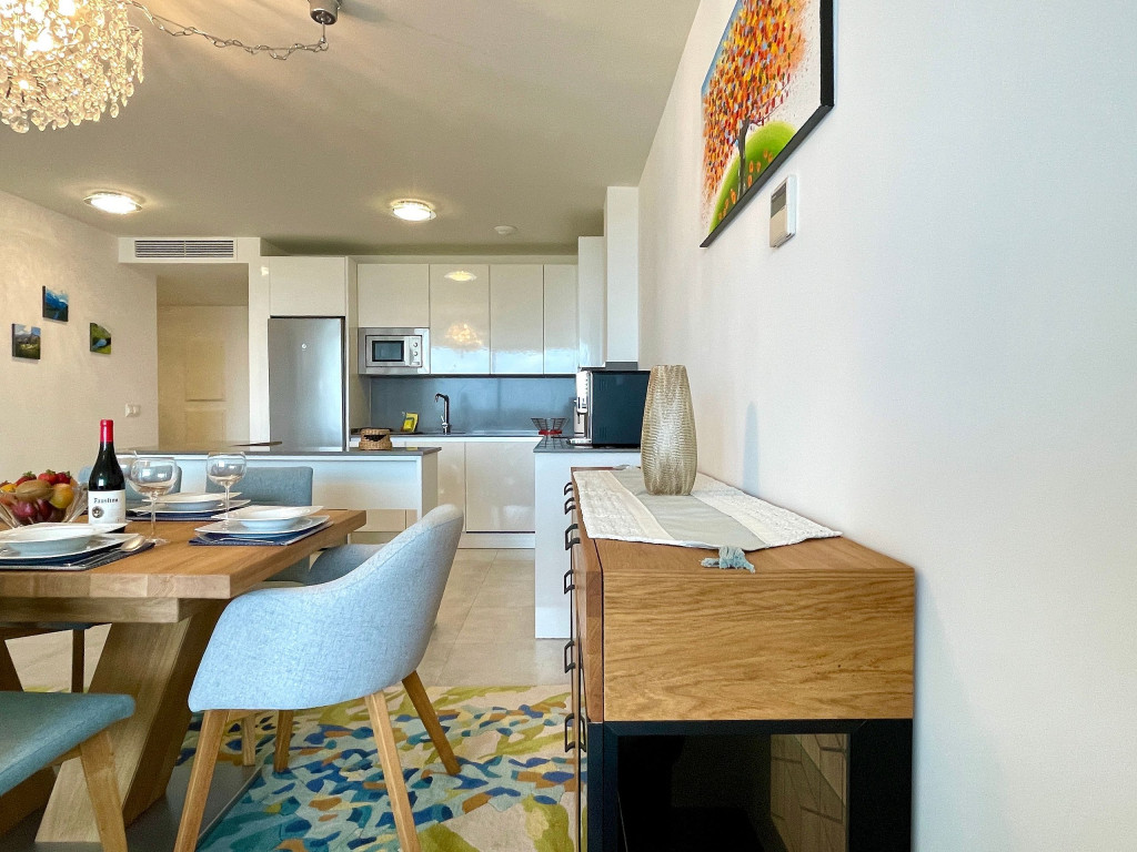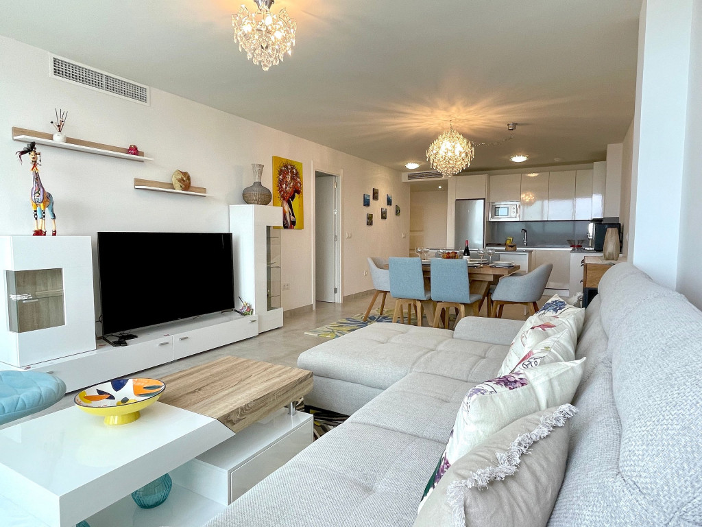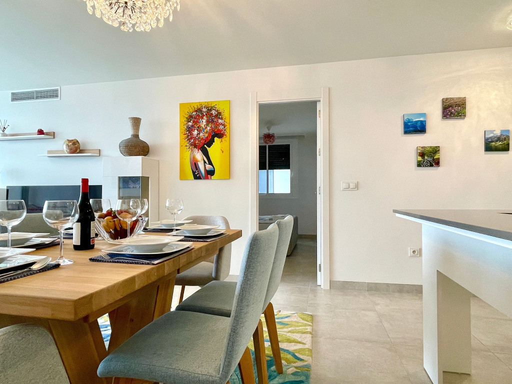 Uma excelente casa de férias com vista para o mar a partir do terraço privado, apartamento de 3 quartos decorado com bom gosto para até 6 pessoas. Casa de férias totalmente equipada. Funcionalidades na comunidade Casa Banderas: Campo de Padel, jacuzzi, Ginásio e Barbecues Comunais.