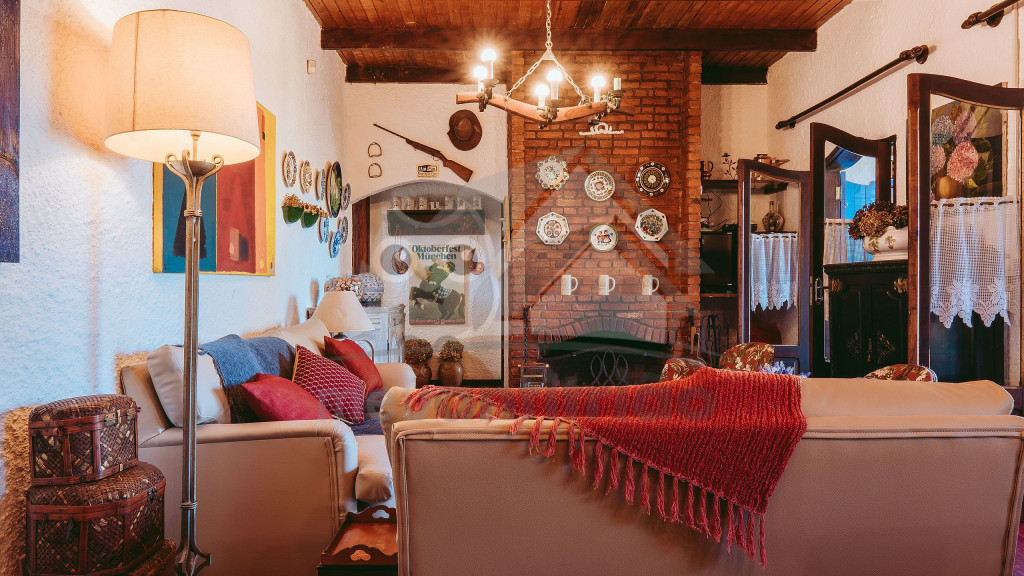 Logo ao entrar na casa, o hóspede terá acesso à uma sala de TV espaçosa com lareira integrada e sala de jantar com mesa e cadeiras. Próximo a ela, temos uma cozinha completa com todos os utensílios necessários para a estadia.