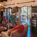 Da sala, também é possível acessar uma ampla varanda com mesas, cadeiras, poltronas e uma churrasqueira.