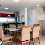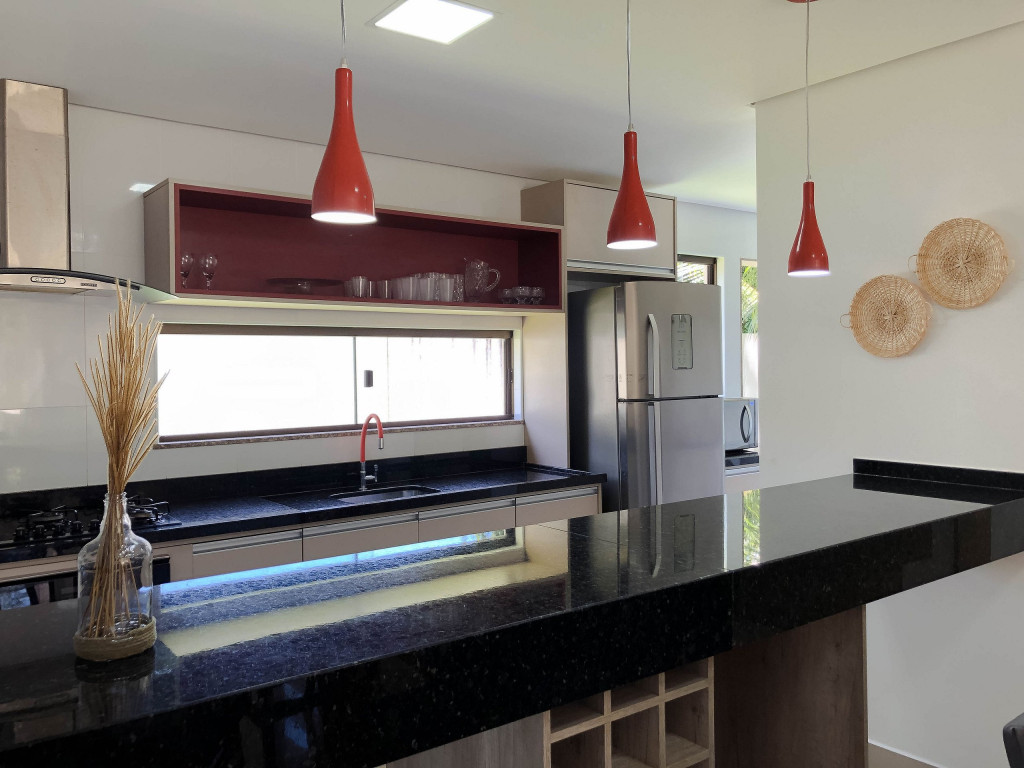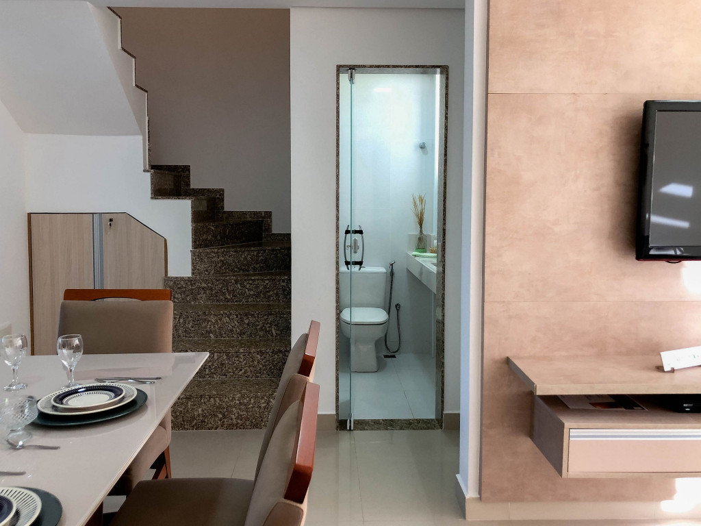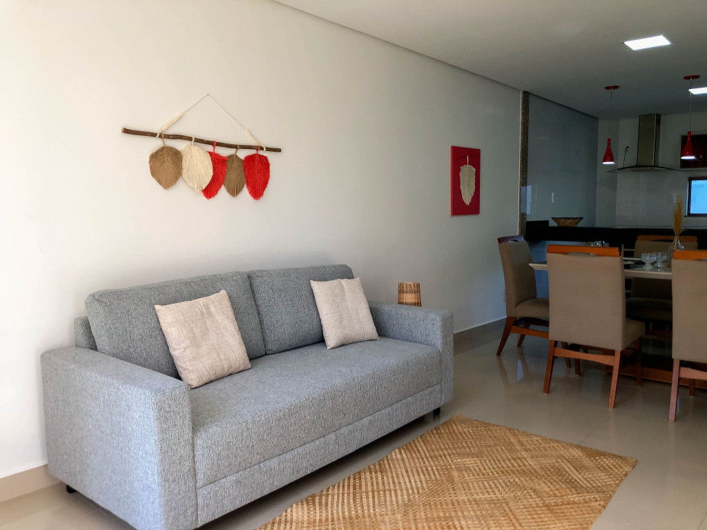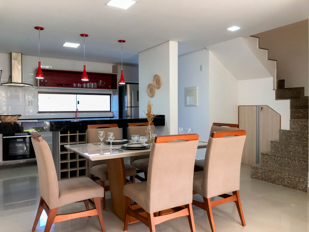 Logo ao entrar na casa, o hóspede encontrará uma sala com TV e, integrada a ela, temos um lavabo, uma sala de jantar e uma cozinha com todos os utensílios necessários para a estadia.