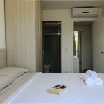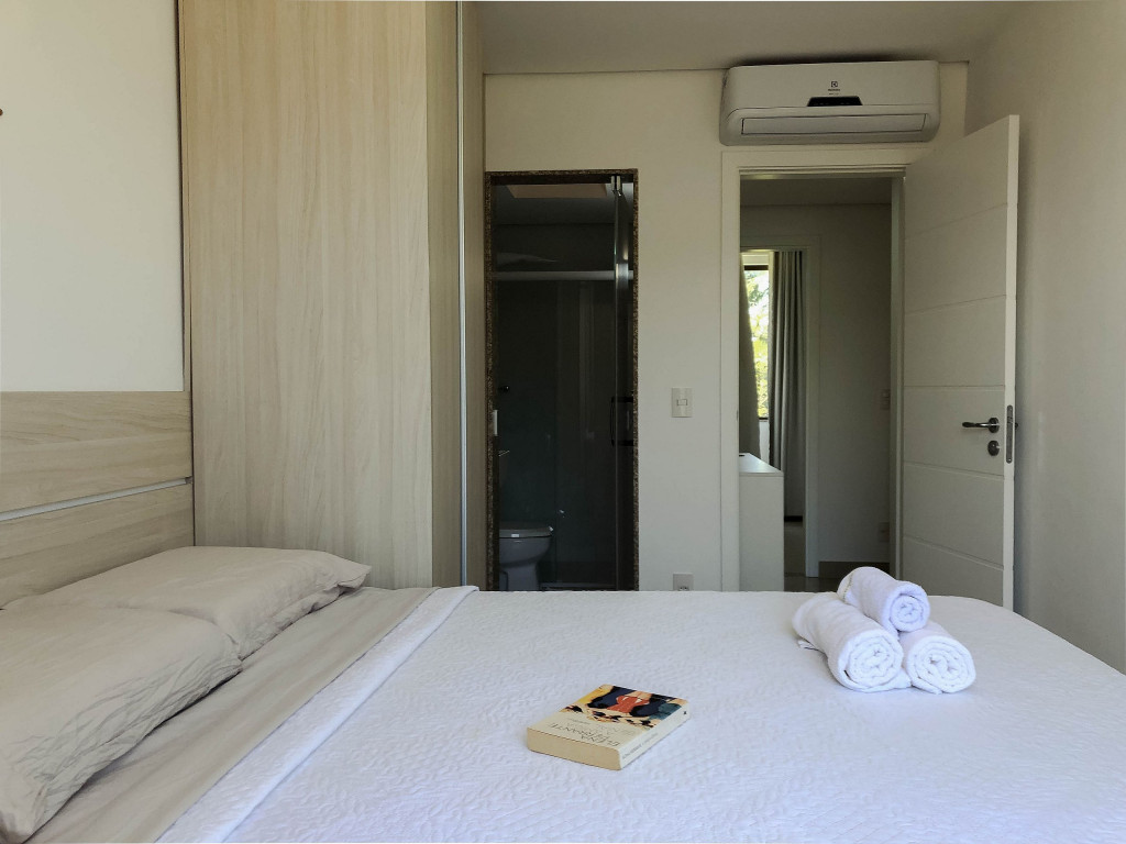 Subindo as escadas, temos 3 suítes, sendo uma com cama queen e duas com cama de casal. Todos os quartos possuem ar-condicionado.