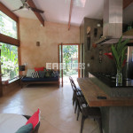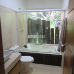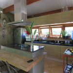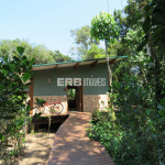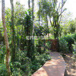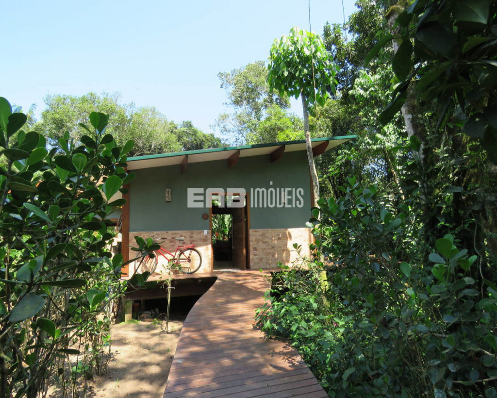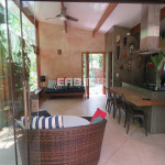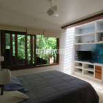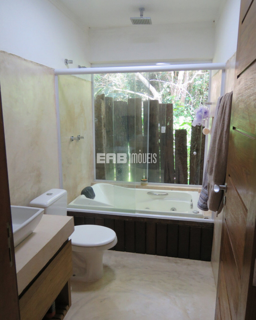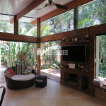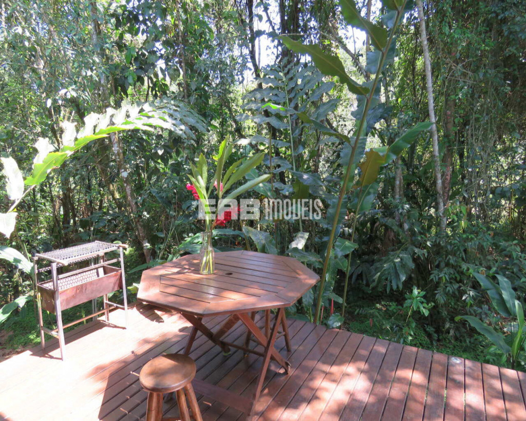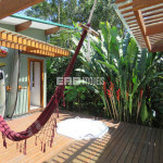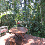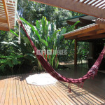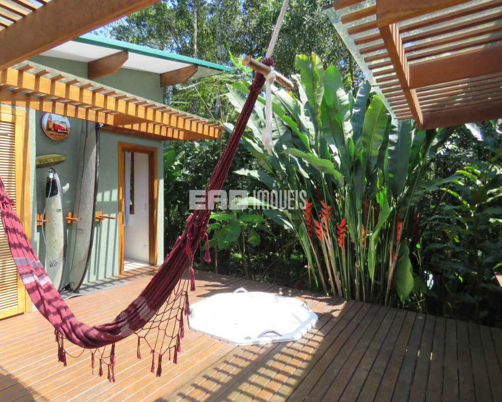 Linda casa erguida do solo, protegida da umidade, com a ala social separada da ala íntima por um deck de madeira que acomoda hidromassagem em meio à natureza.