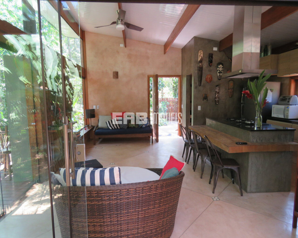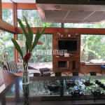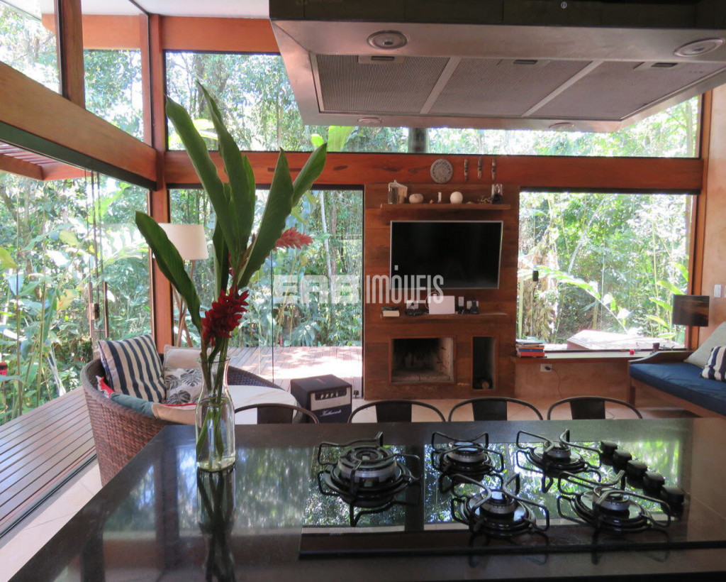 Esse é, aliás, um dos pontos altos dessa residência, que valoriza o verde ao redor e o acolhe na sala de estar envidraçada, que forma um ambiente único e extremamete prazeroso com a cozinha gourmet.