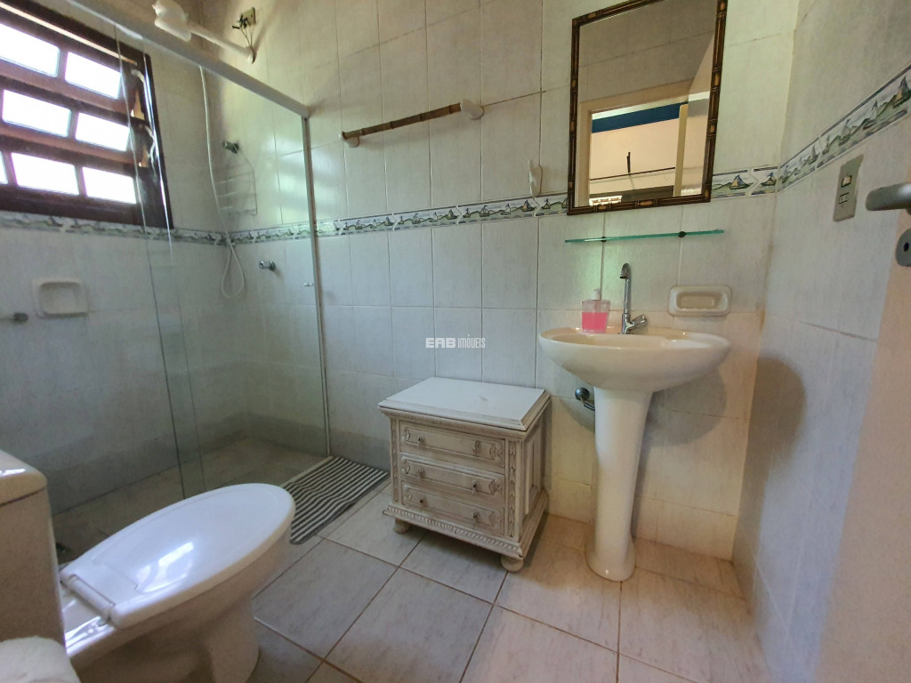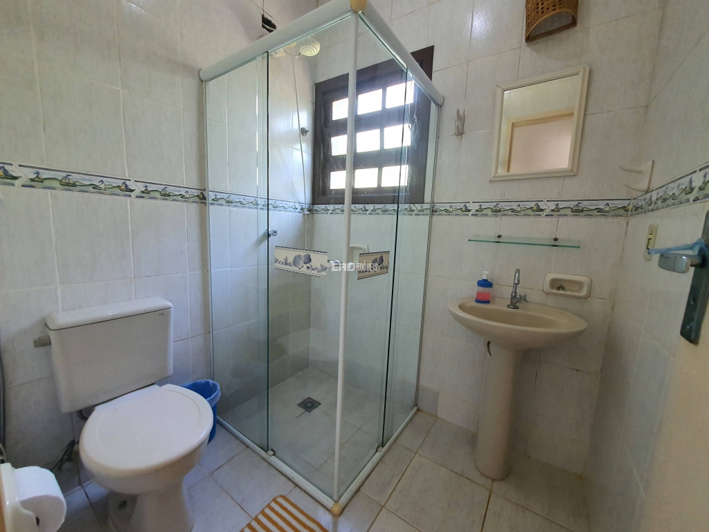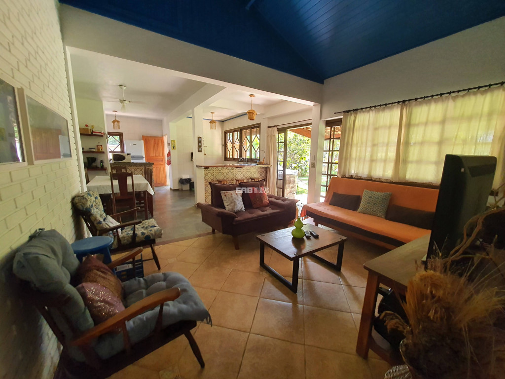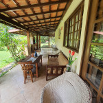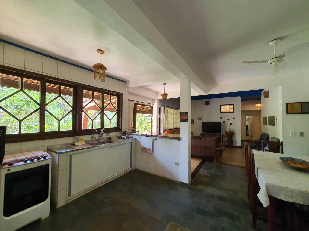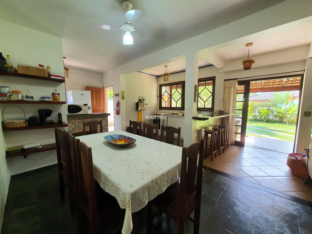 Primeira casa a partir da praia. Casa espaçosa, com 5 dormitórios, sendo 3 suítes, que se abrem para a varanda e recebem a brisa do mar. Alvenaria com acabamento de tijolo à vista, portas e janelas em mogno. Ampla e agradável varanda com churrasqueira, envolta por muito verde. Excelente localização, bem equipada e confortável.