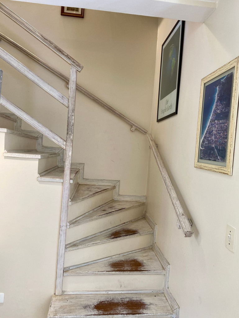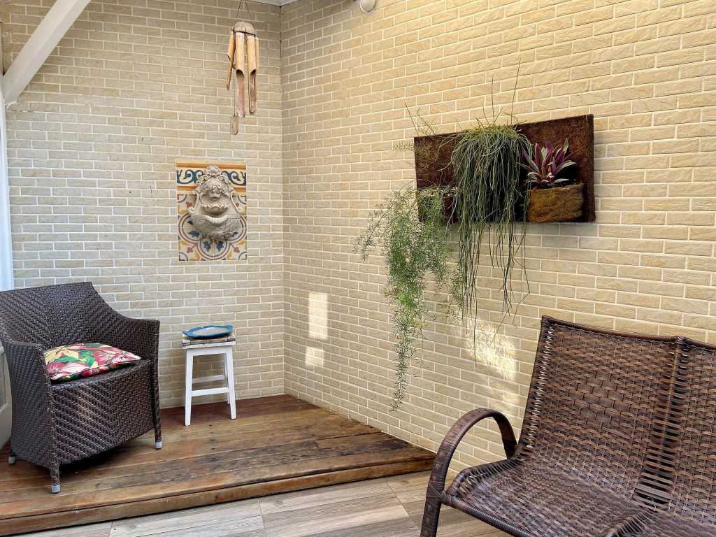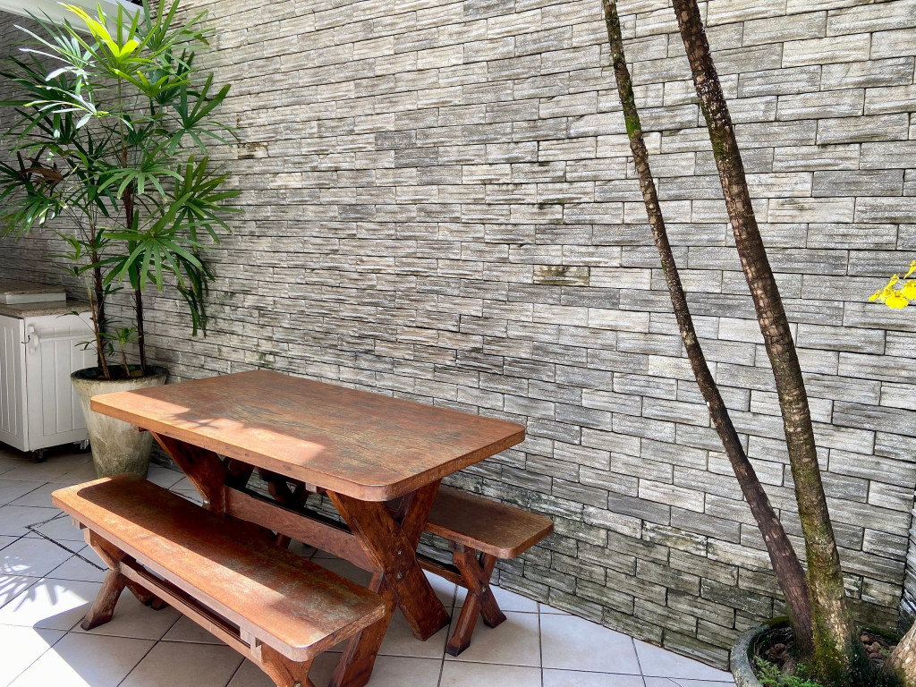 No térreo ficam a sala, cozinha e varanda. No primeiro pavimento uma suíte, dois quartos e um banheiro. No segundo pavimento fica a suíte principal.