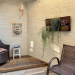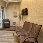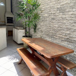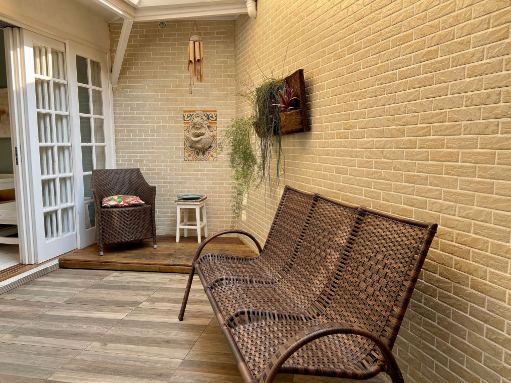 A varanda possui poltronas, churrasqueira e frigobar.