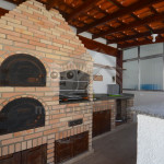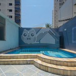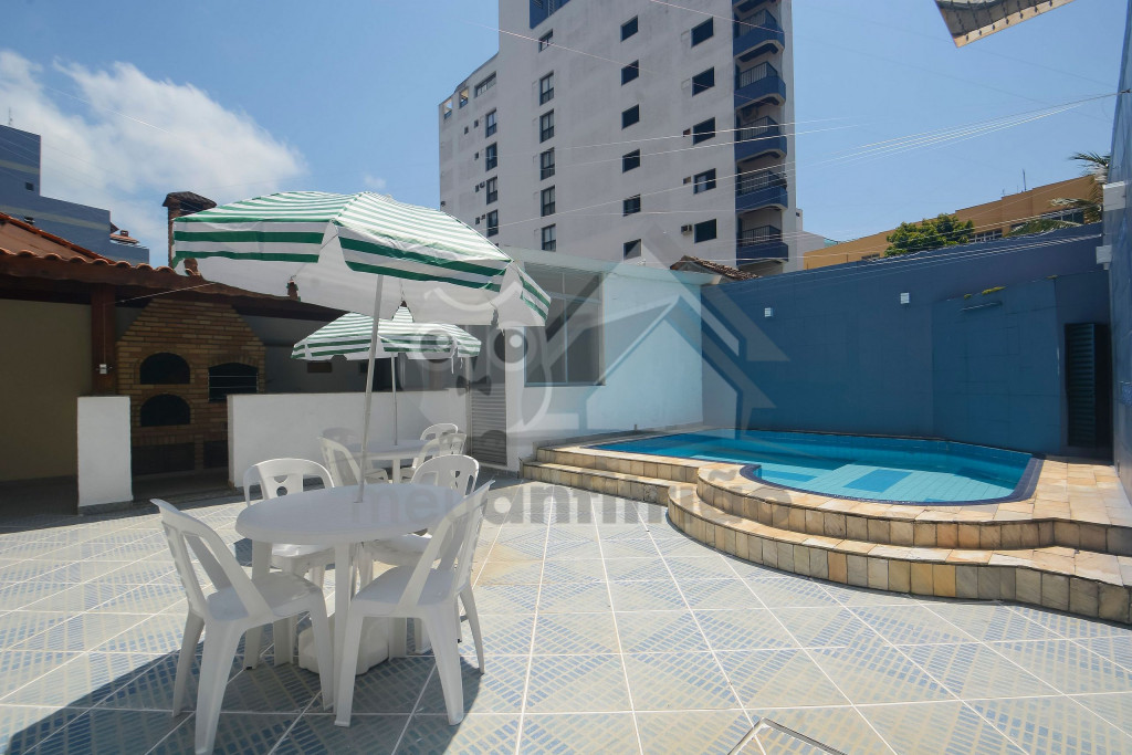 Próximo deste quartinho, temos uma piscina rasa, mesas com guarda-sóis e uma churrasqueira.