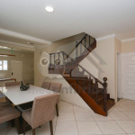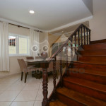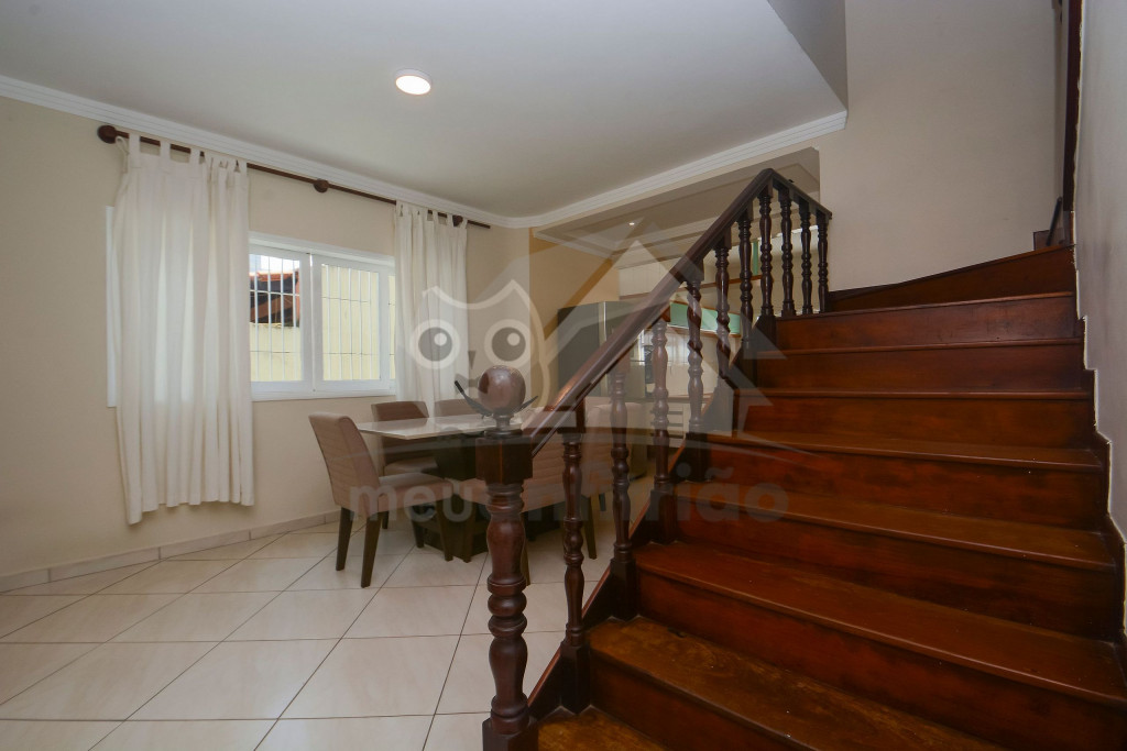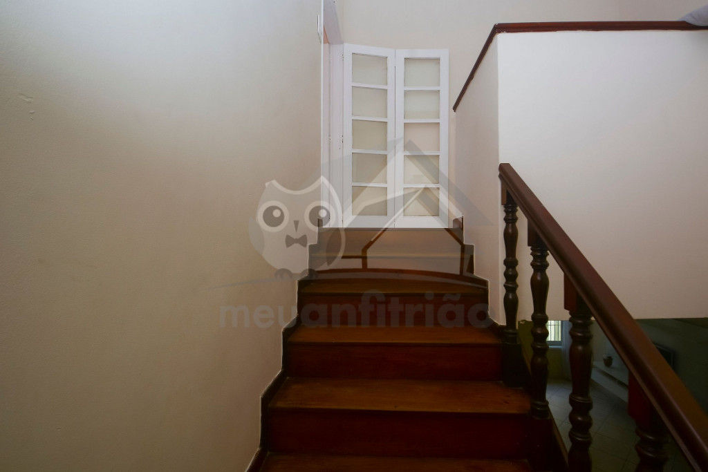 Subindo as escadas para o primeiro andar, temos 3 quartos, sendo: uma suíte com 2 camas de casal e 2 quartos com 1 cama de casal e 1 cama de solteiro, que compartilham um banheiro. A suíte e um dos quartos possuem ar condicionado, já o outro possui ventilador portátil.
