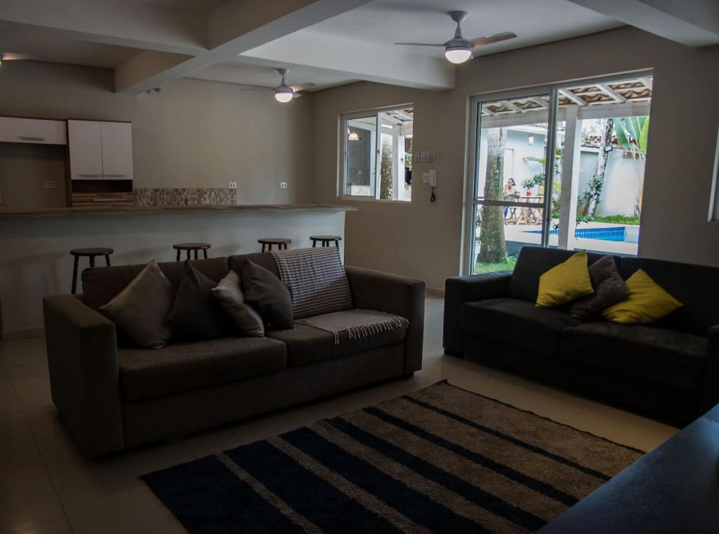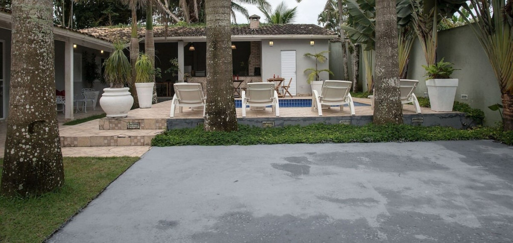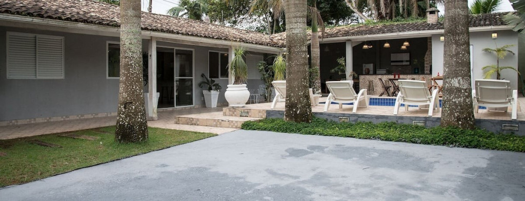 A casa foi recentemente reformada, teve todos seus móveis trocados, é bem arborizada e acomoda 16 pessoas. Fica a 350 metros da Praia de Pernambuco, no Guarujá, próximo também de comércios, shopping, casas de show e golf club.