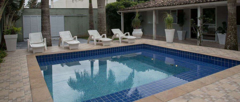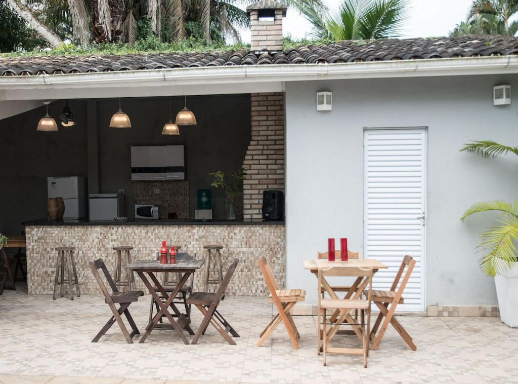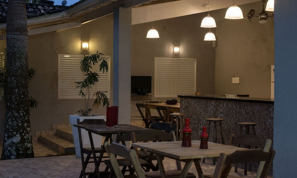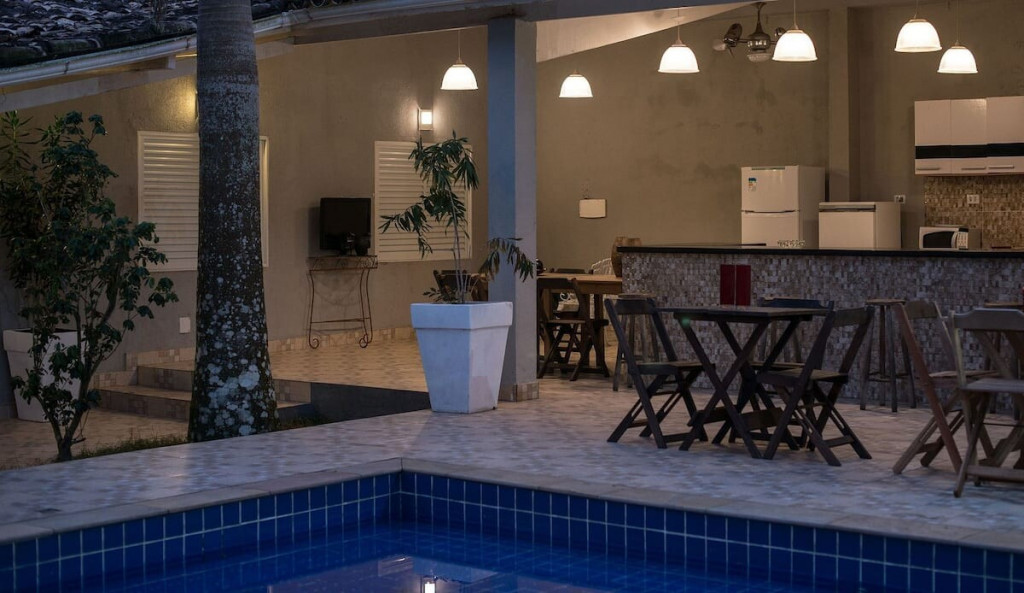 Possui uma decoração iluminada e paisagista, foi planejada para uma estadia de conforto e lazer, equipada com uma bela piscina acoplada a um espaço gourmet completo, com mesas e cadeiras e um amplo espaço. O imóvel permite a realização de festas durante a estadia.