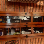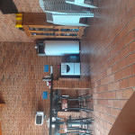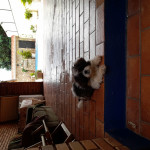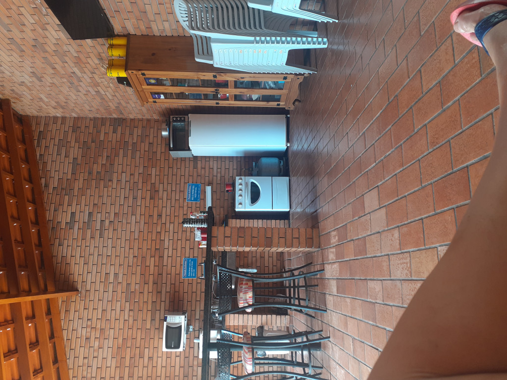 Varanda gourmet com churrasqueira, mesas e cadeiras.