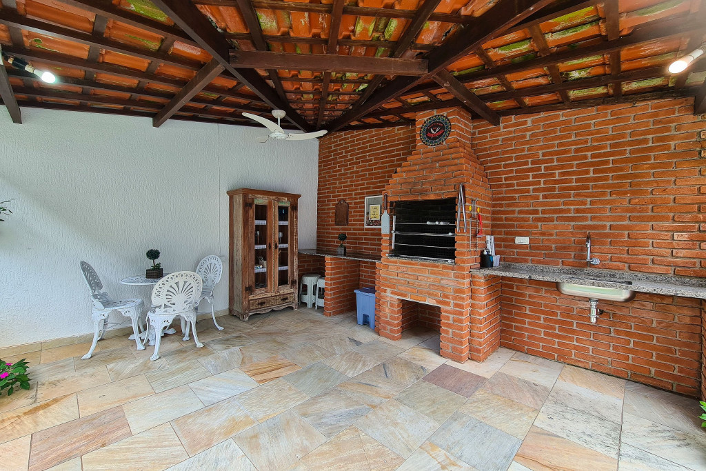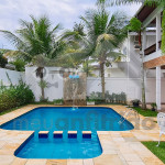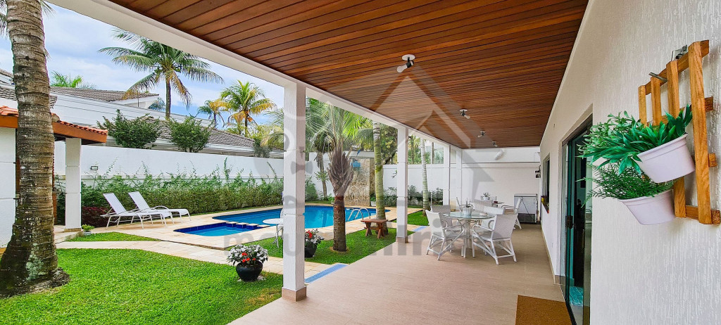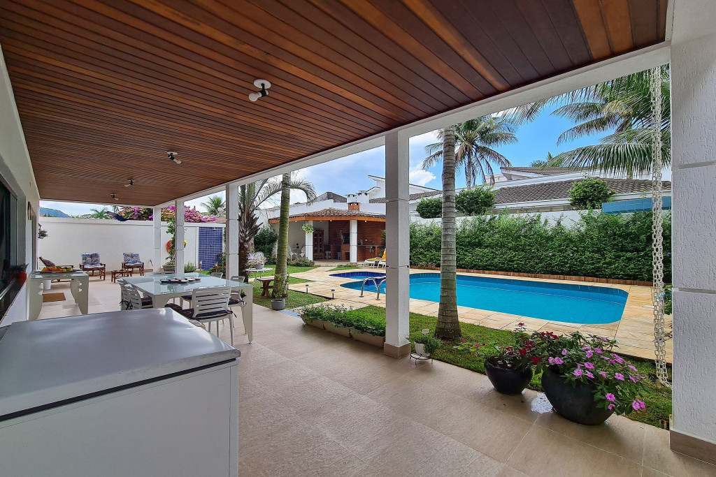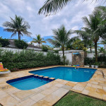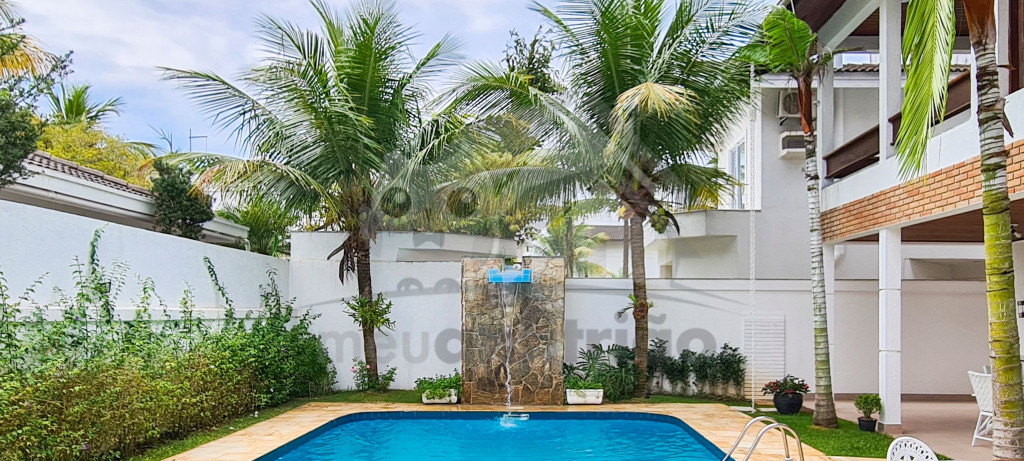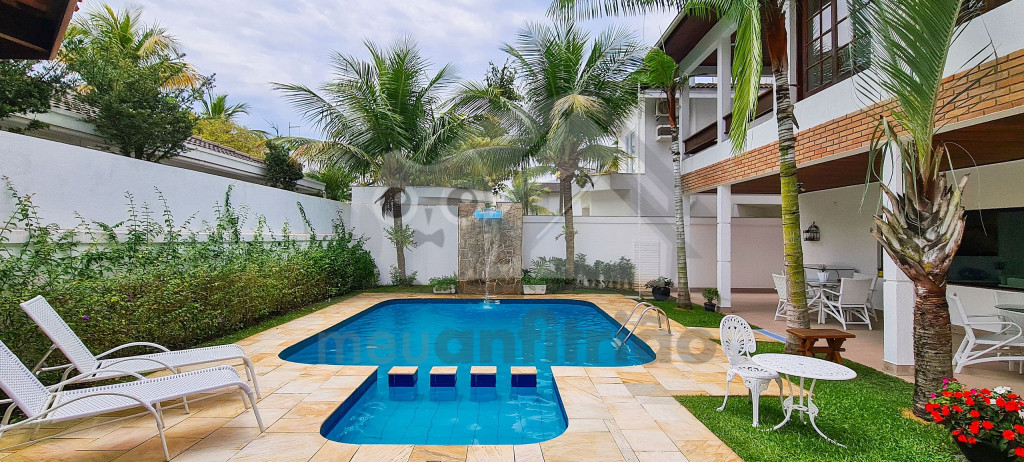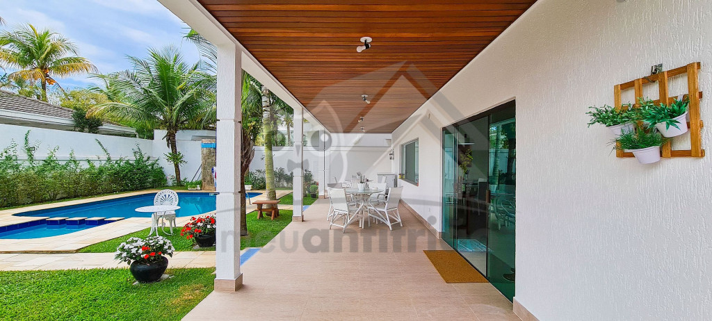 A área externa é um dos pontos altos da casa, com varanda aconchegante, piscina com cascata, ducha e churrasqueira.No local também há vagas para 4 carros.