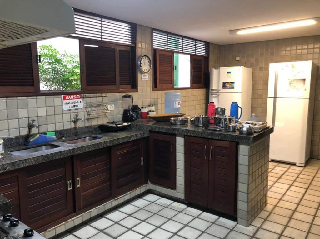 - Cozinha americana totalmente equipada com geladeira, fogão, utensílios de louça e eletrodomésticos.