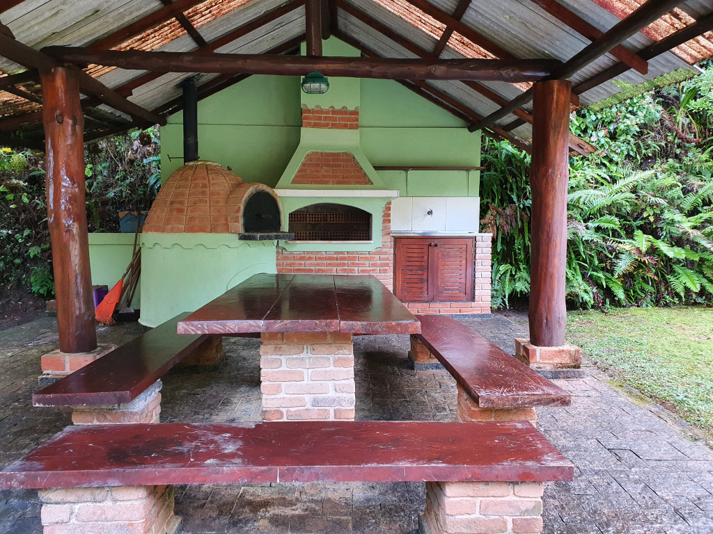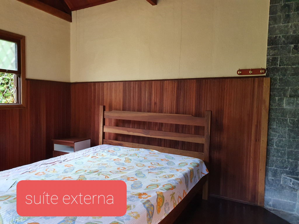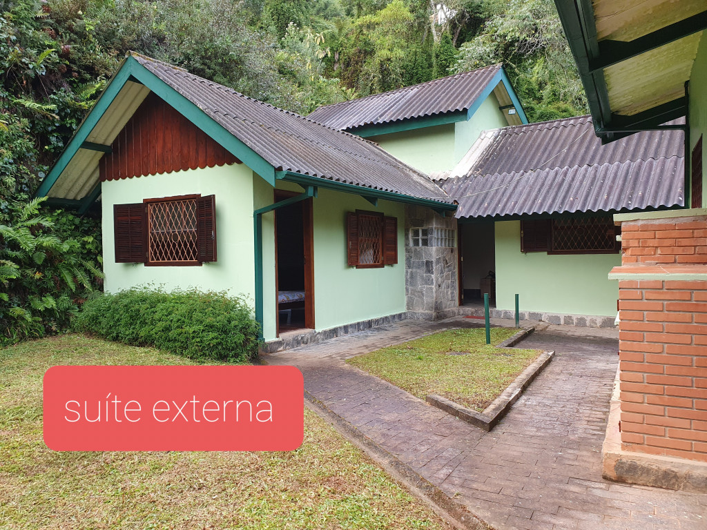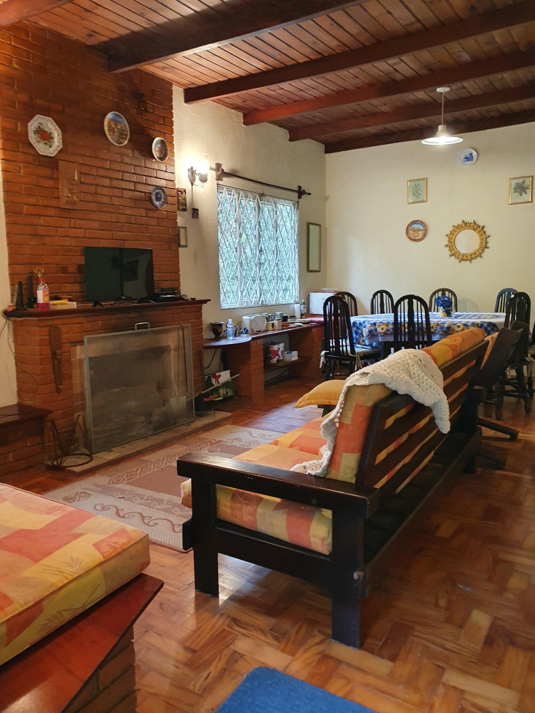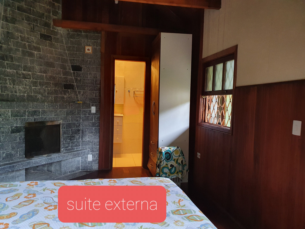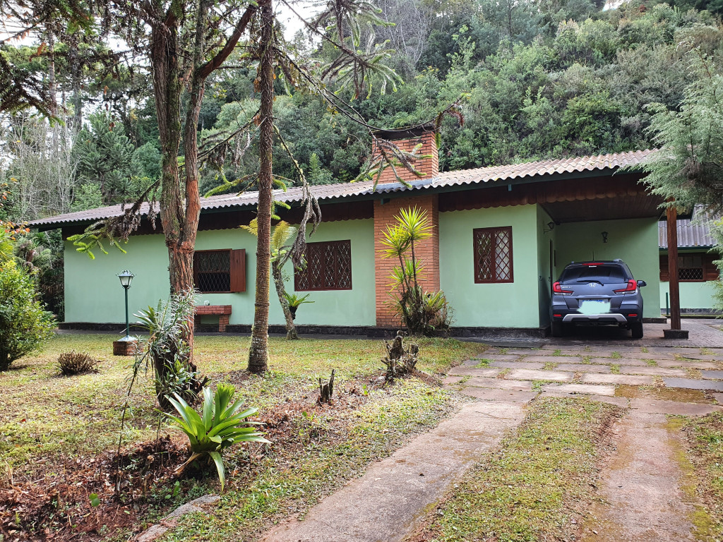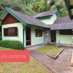 Casa na Natureza e ao lado (1,2Km) do Centrinho do Capivari. Casa térrea com 3 quartos,3 banheiros,cozinha,sala de estar/jantar com lareira e,ao lado,suíte externa(com banheiro privativo e mini lareira). Terreno de 1.000m2 c amplo gramado. Área de lazer coberta com churrasqueira e forno de pizza. 6 vagas de garagem(1 coberta)