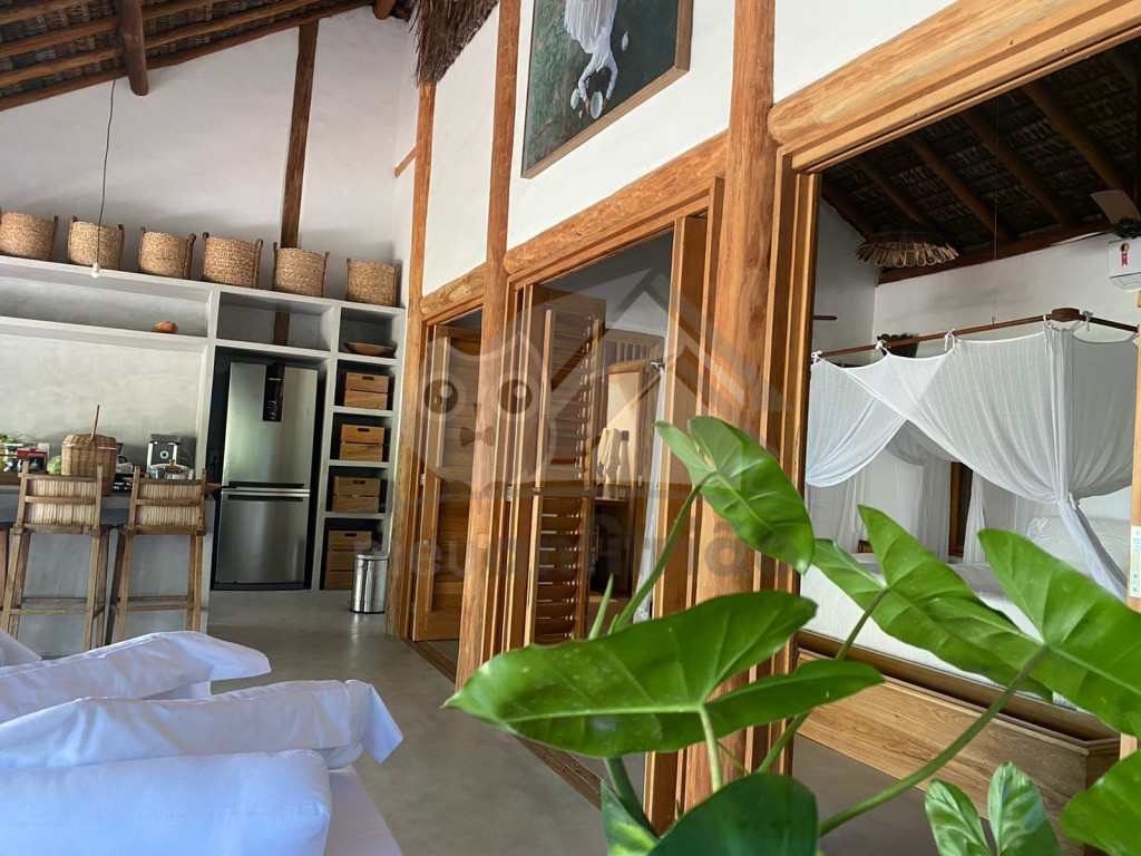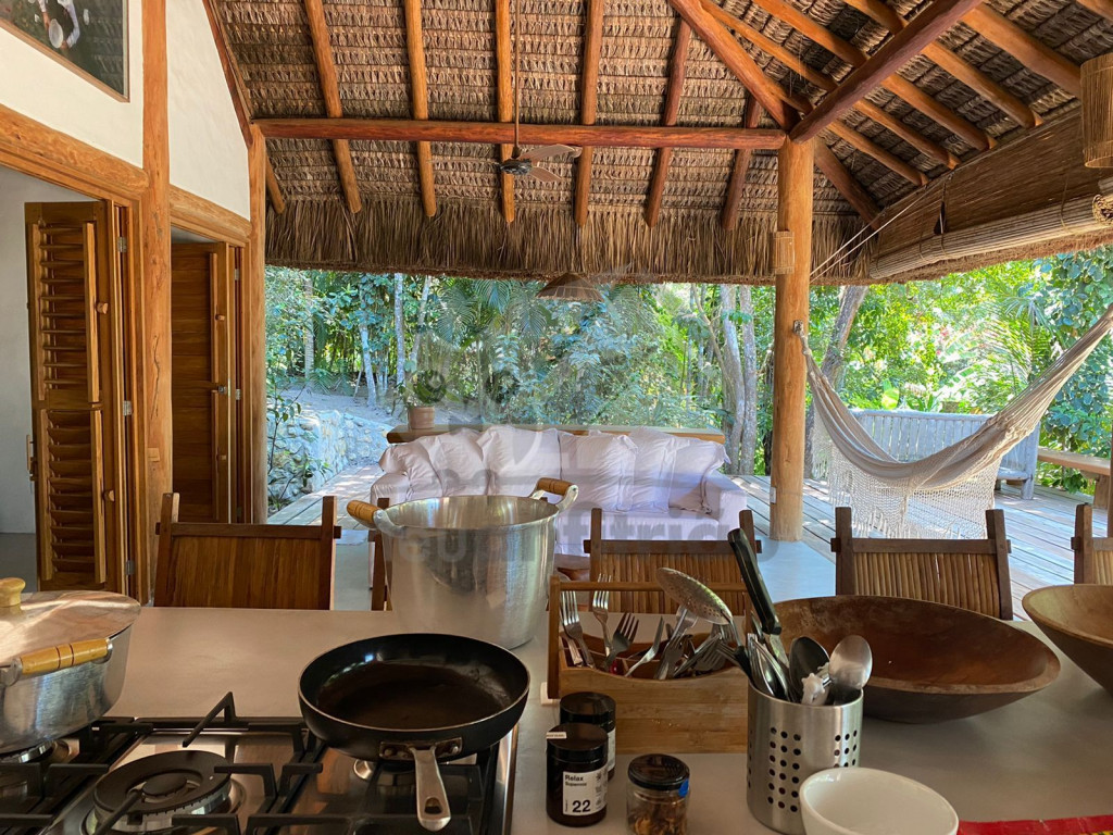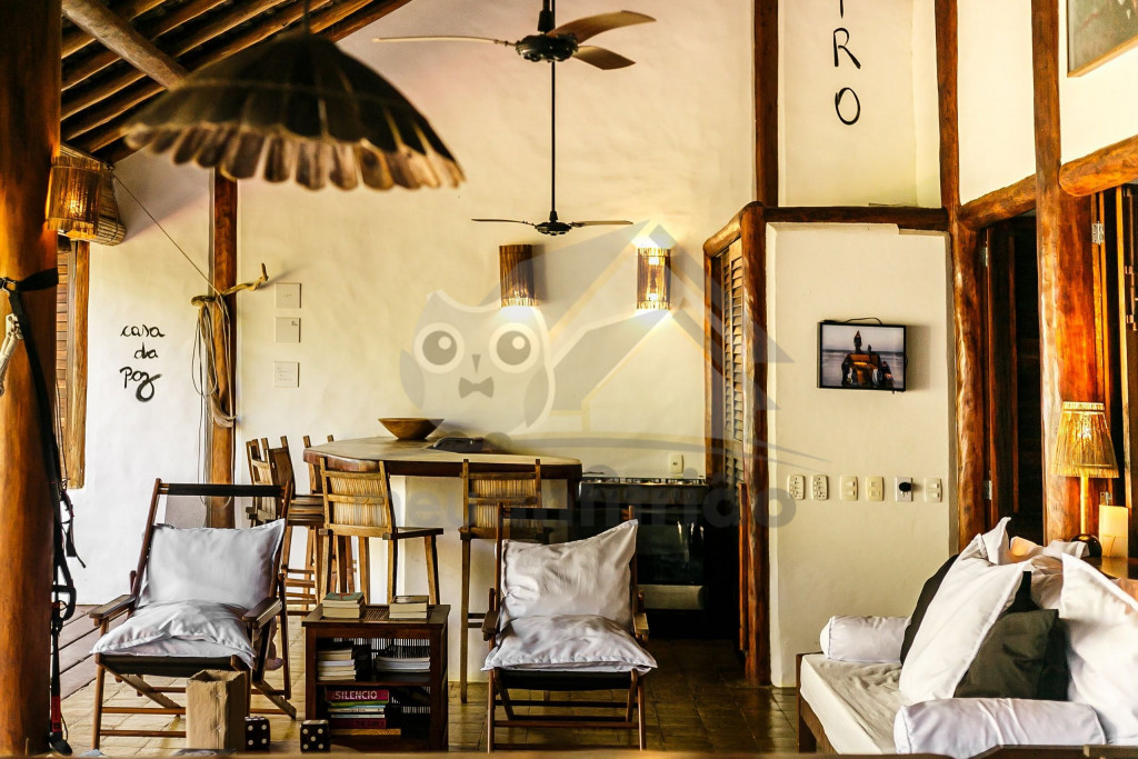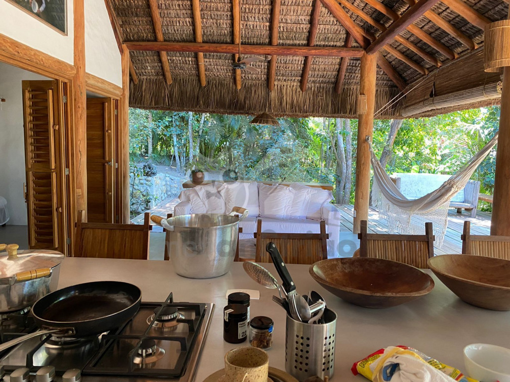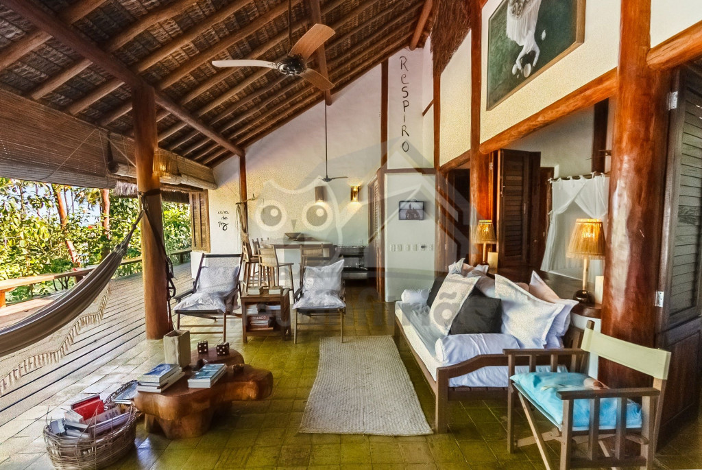 A sala é ampla e conta com sofás, poltronas e redes de descanso. A cozinha é completa com todos os utensílios necessários para o dia a dia. A surpresa aqui é que os dois ambientes (sala e cozinha) são ao ar livre e integrados a uma varanda bem grande com uma vista incrível do mar, perfeito para aproveitar os melhores momentos em família em contato com a natureza. Oferecemos, ainda, internet e serviço de TV a cabo (Sky).