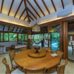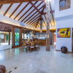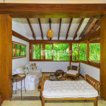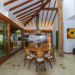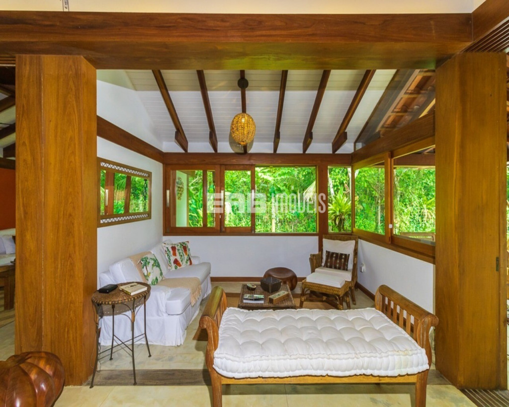 O belíssimo tronco de árvore em meio à ampla sala intensifica o convívio com a natureza, que é valorizada por amplas aberturas de vidro. Estas garantem a iluminação natural e a passagem da brisa que vem do mar, nutrindo os hóspedes com o aroma da maresia.