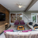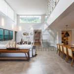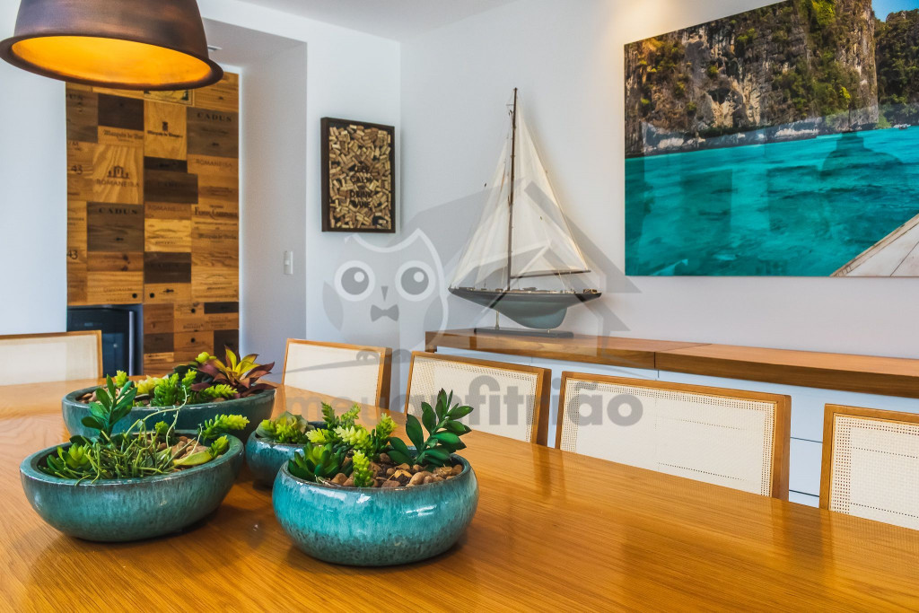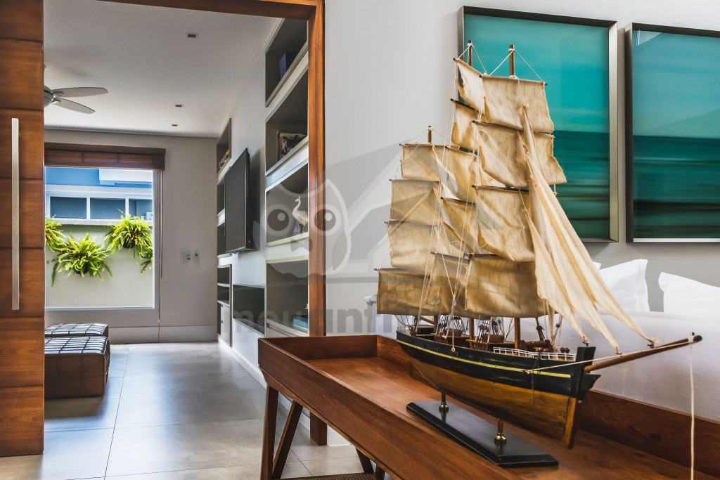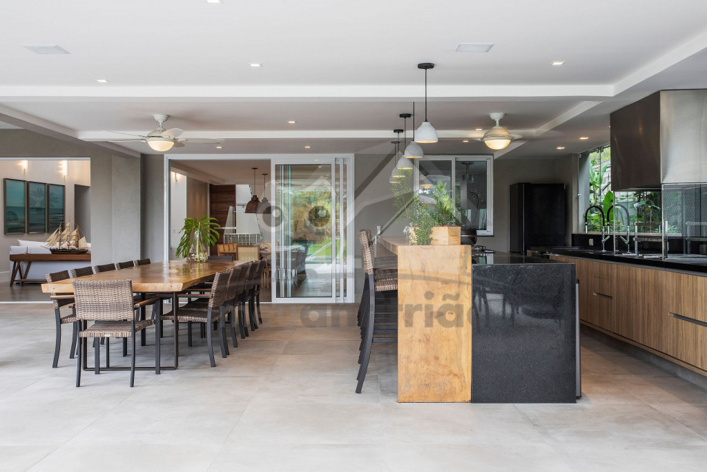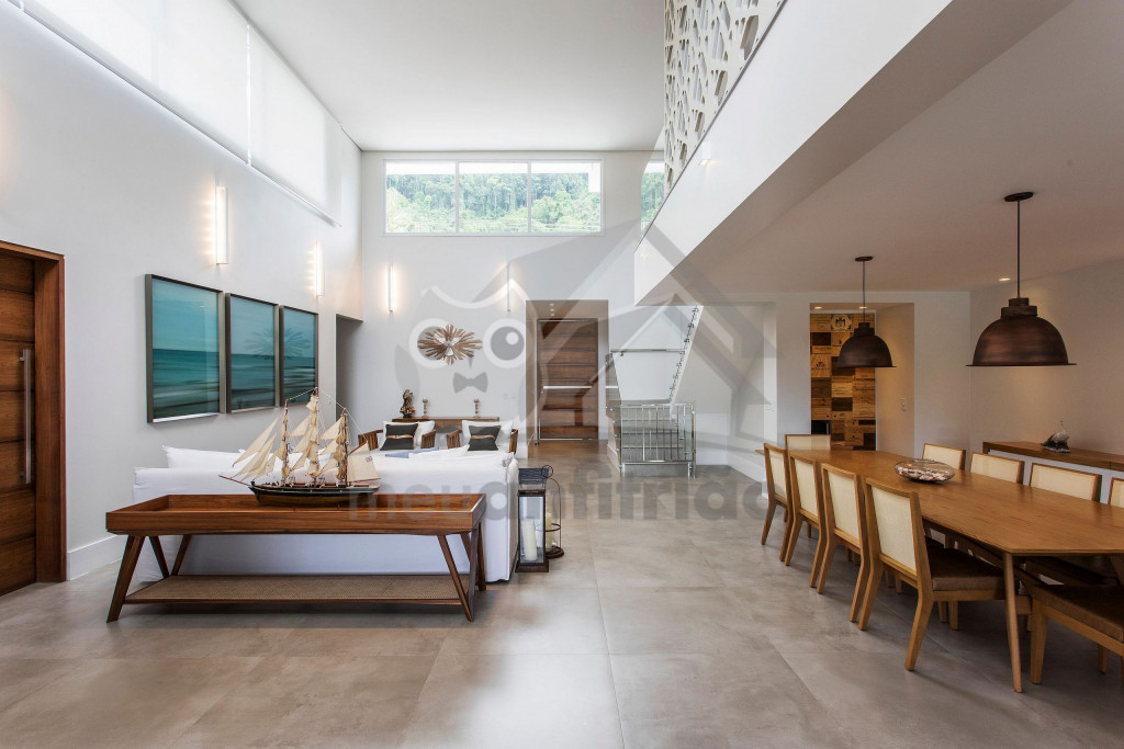 Logo ao entrar na casa, o hóspede terá acesso a uma sala de estar com sofás e poltronas e uma sala de jantar integrada à ela. Próximo deste espaço, temos uma sala de TV com sofá amplo. No mesmo piso, há uma cozinha completa com todos os utensílios necessários para a estadia.