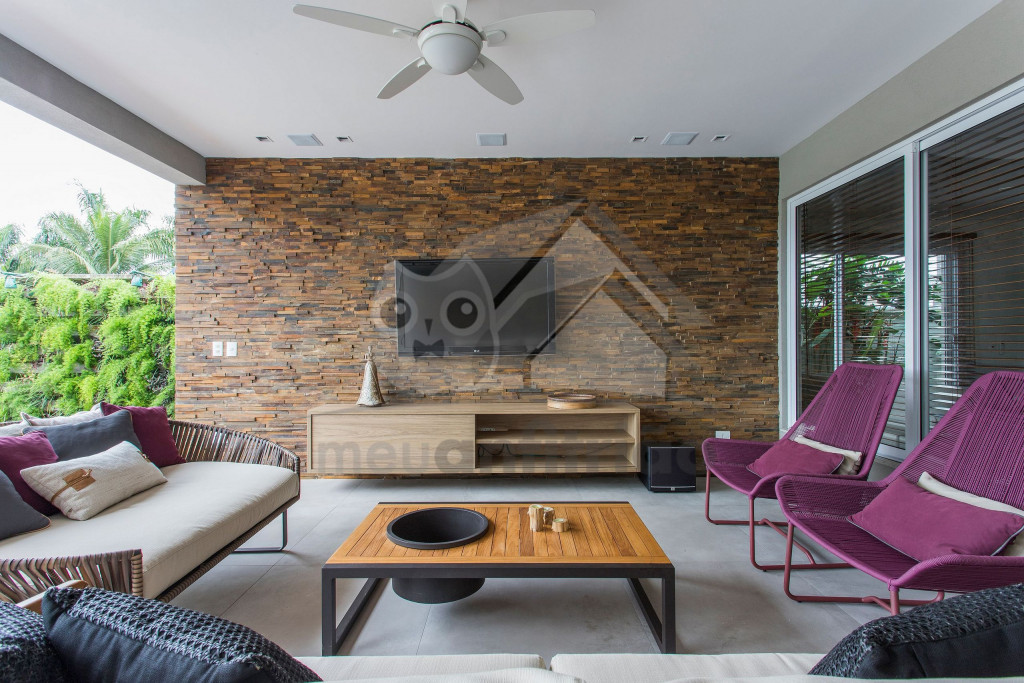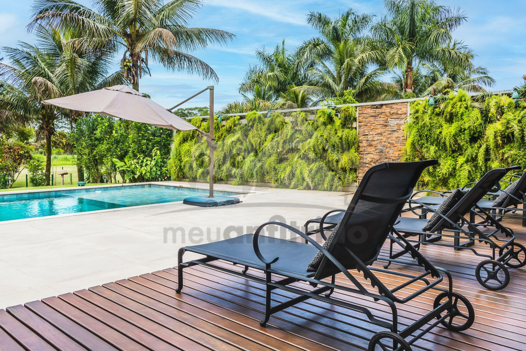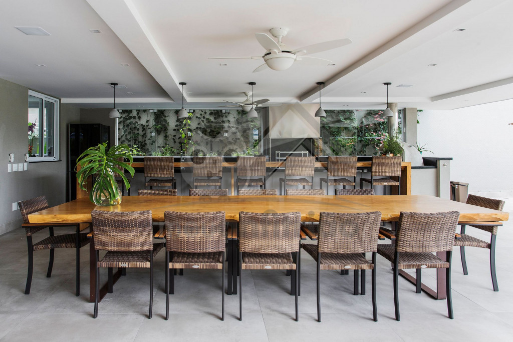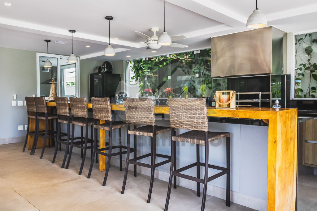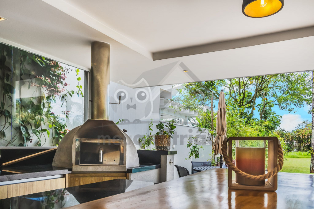 A área externa é o ponto alto da casa e conta com varanda gourmet com sofás, mesas, TV, churrasqueira, forno de pizza, cooktop, geladeiras e um freezer, piscina aquecida, spa, jacuzzi aquecida, sauna e um amplo jardim ao fundo.