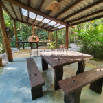 - Sala de estar com lareira e cozinha americana abertas para o deck de cumaru, com o fogão a lenha sob uma cobertura de vidro, que protege da chuva e não impede a visão do céu.