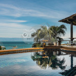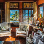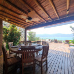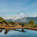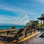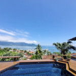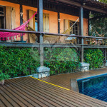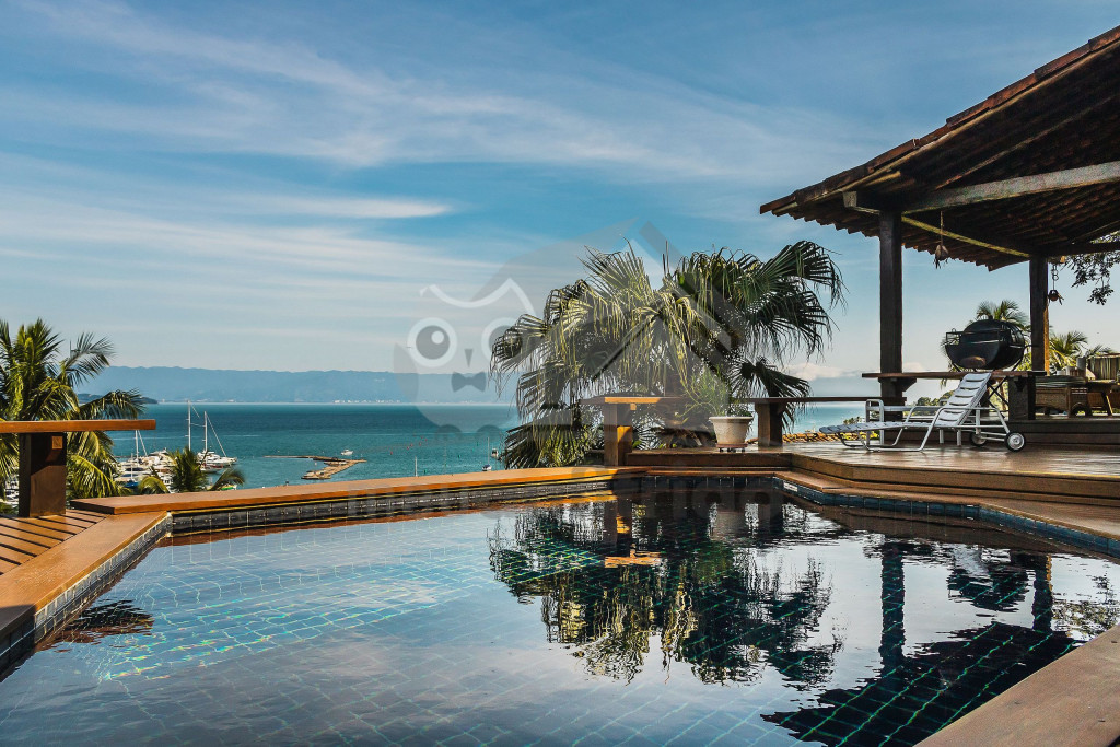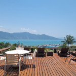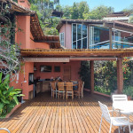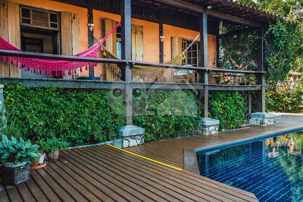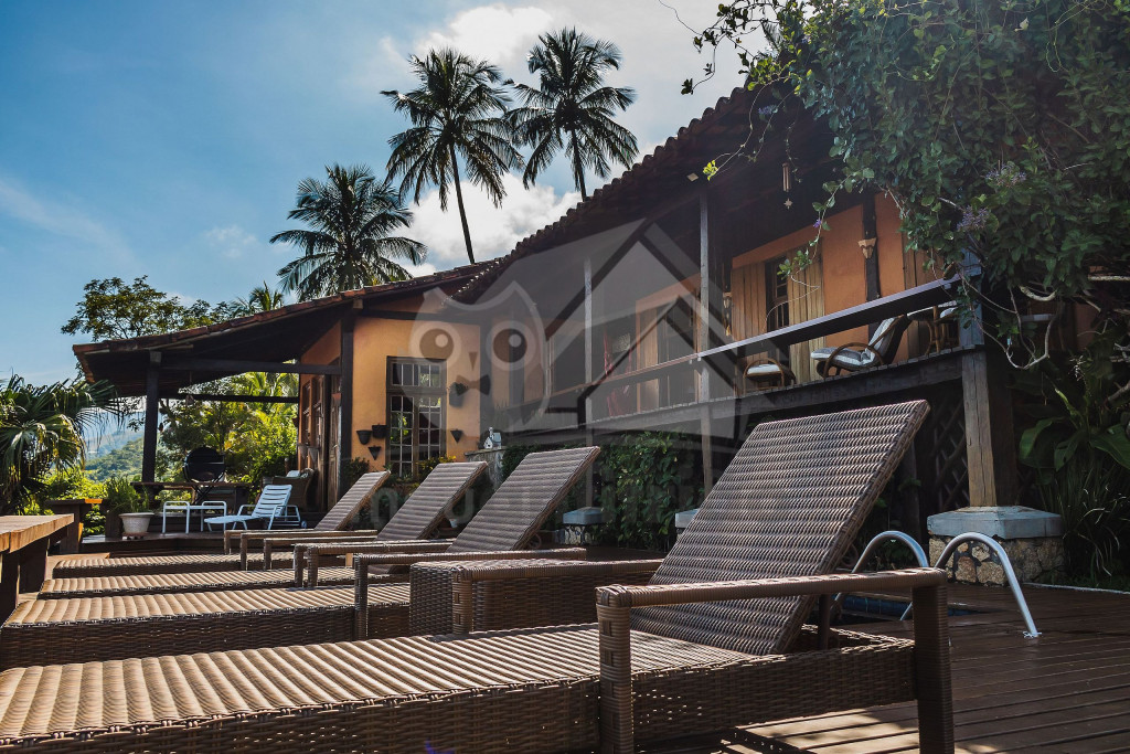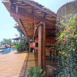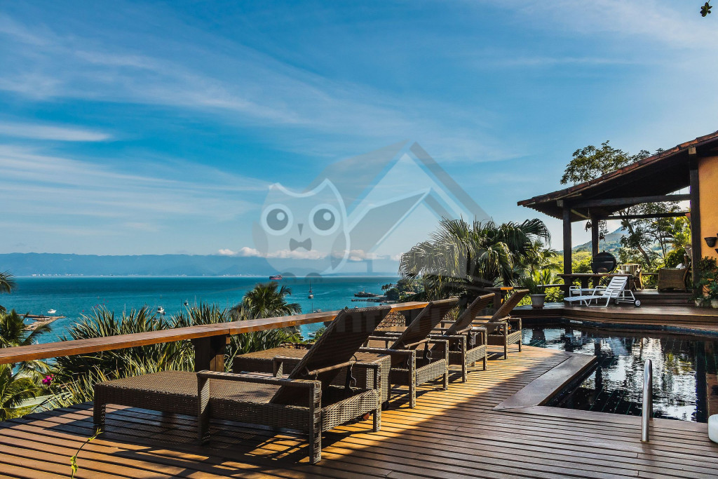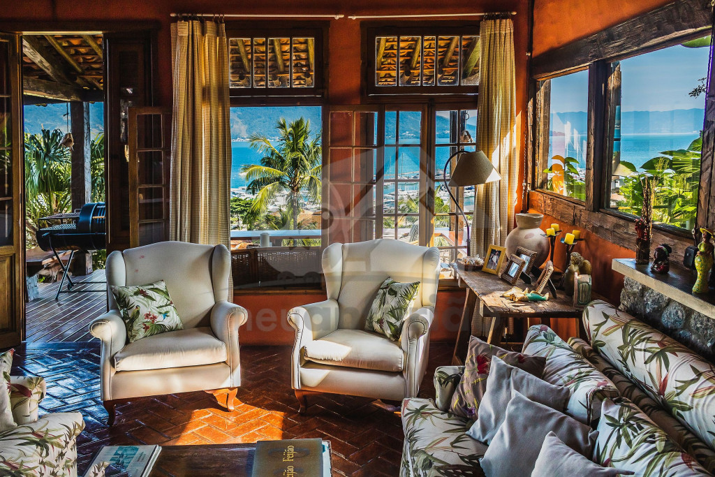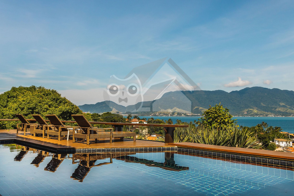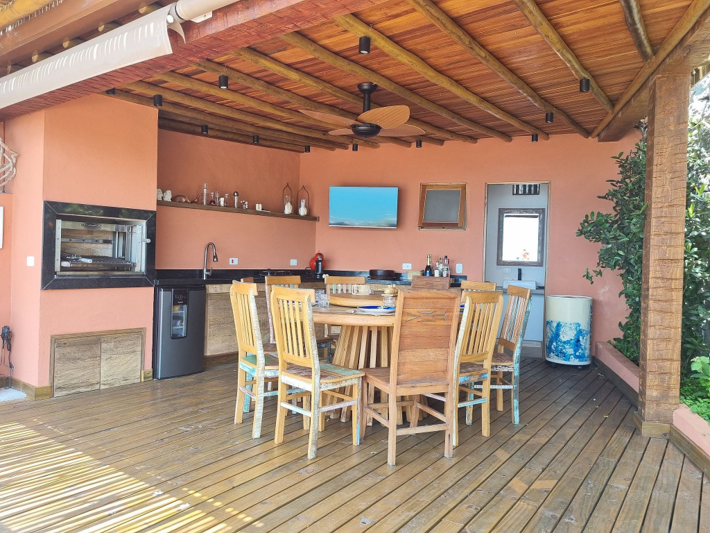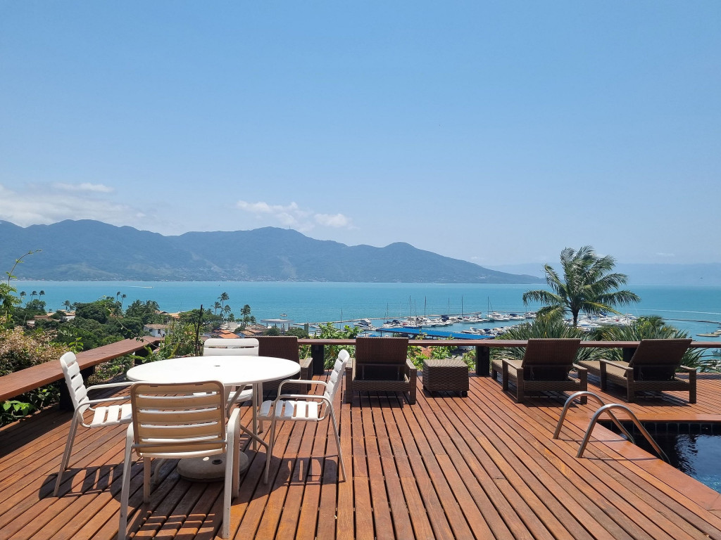 Descendo as escadas da sala de jantar, temos uma sala de estar com sofás, poltronas, TV Smart e uma varanda com acesso ao deck. O deck é amplo e conta com piscina, espreguiçadeiras, um pequeno jardim e vista privilegiada do mar.