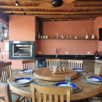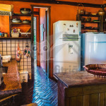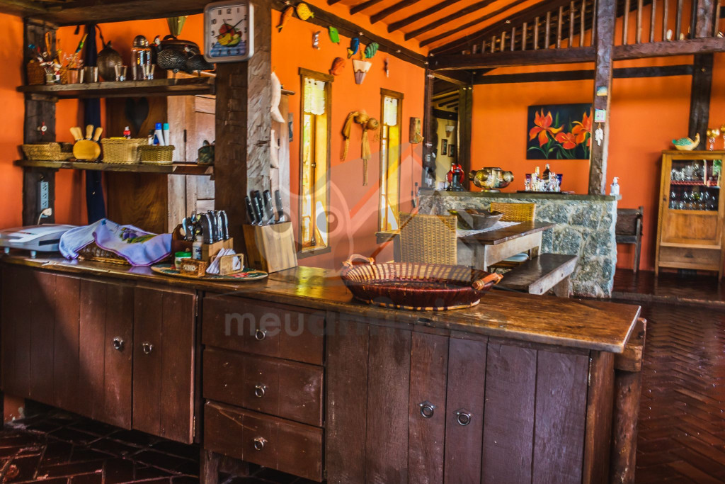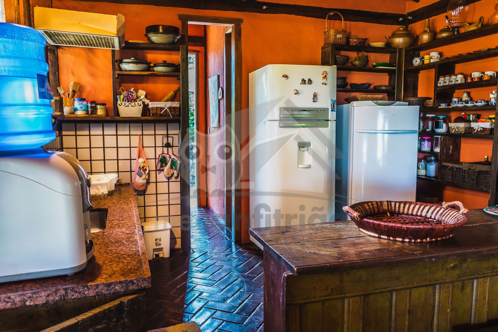 Ao entrar na casa, os hóspedes terão acesso a uma cozinha completa conjugada à uma sala de jantar que dispõe de uma mesa e bancos para refeições.
