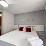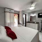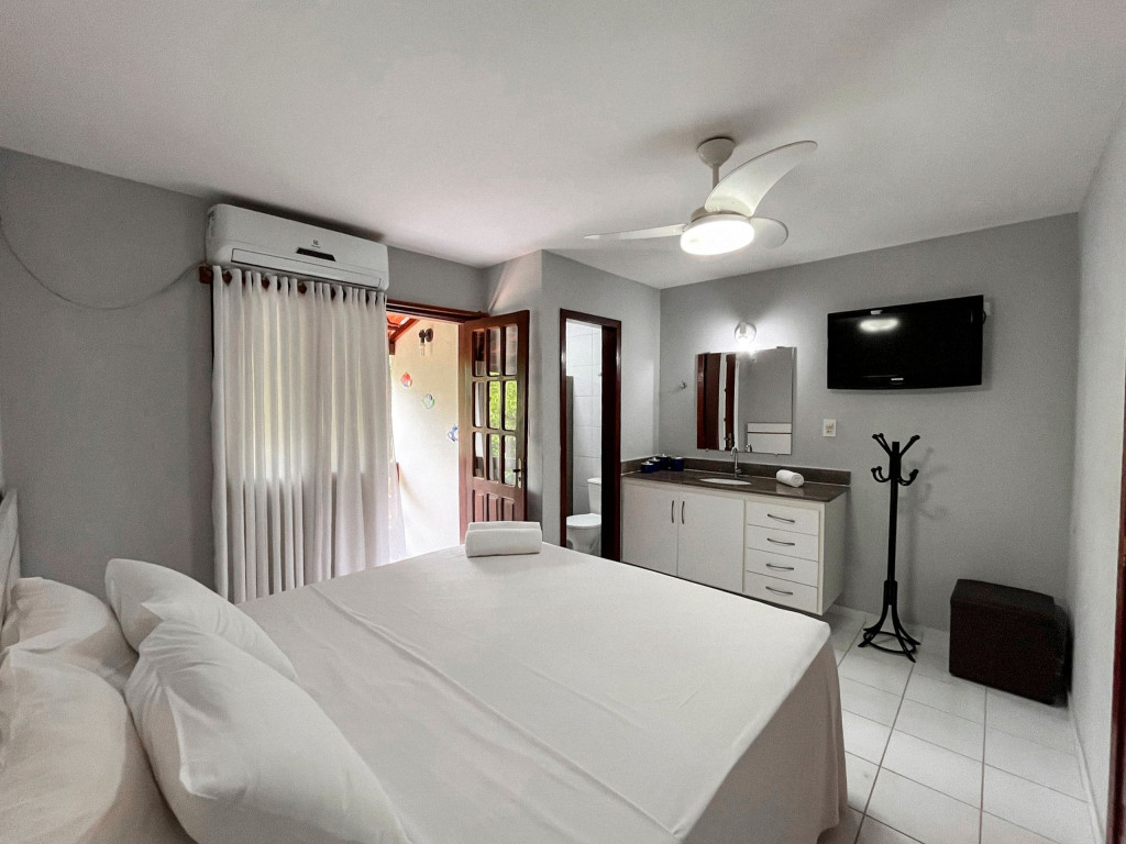 1 suíte no térreo possui ar condicionado, ventilador de teto e uma cama de casal.
