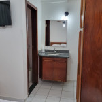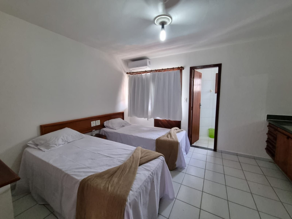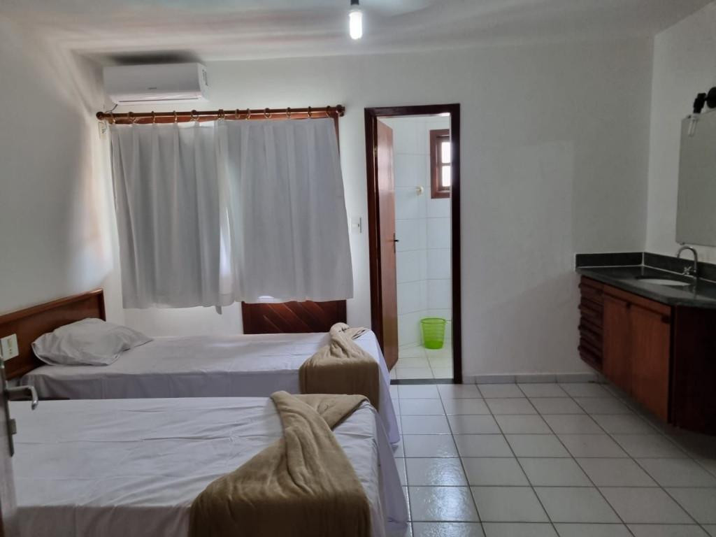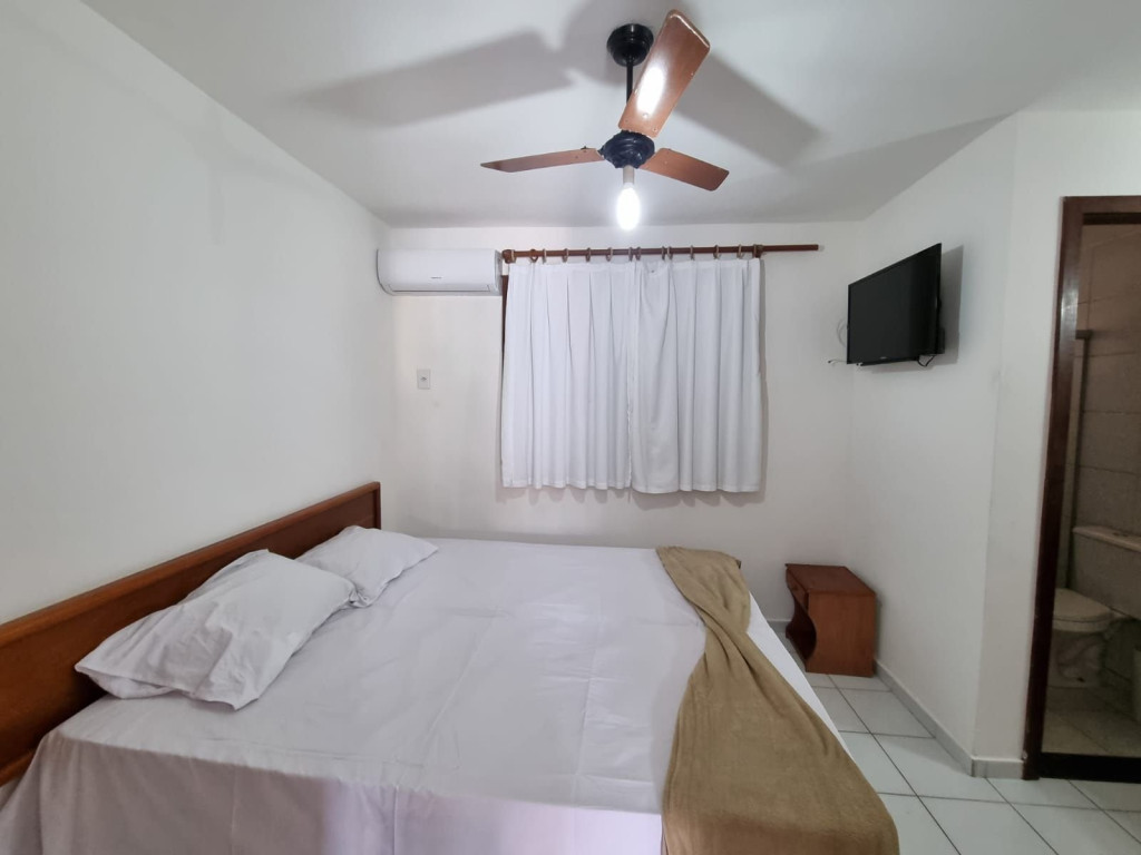 A primeira suíte no térreo possui ar-condicionado, ventilador de teto , 01 cama de casal, travesseiros, . Oferecemos o enxoval de cama e banho. No quarto você ainda terá um roupeiro para armazenar suas bagagens.