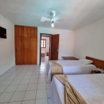 1 cama de casal com 2 camas auxiliares de solteiro, travesseiros ,enxoval de cama e banho, roupeiro para armazenar duas bagagens.