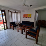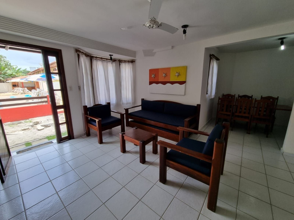 Logo na entrada possui uma ampla sala conjugada com a copa, no qual são compostas com sofá cama de madeira com espumas e almofadas, (acomoda 2 pessoas), 2 poltronas ,mesa de centro, ventilador de teto, rack e TV tela plana. Mesa de madeira com 6 cadeiras.
