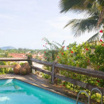 A área externa é linda, com varanda, piscina e churrasqueira com vista para o mar, e jardim florida ao seu redor. Super agradável!