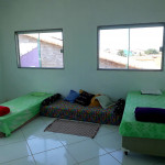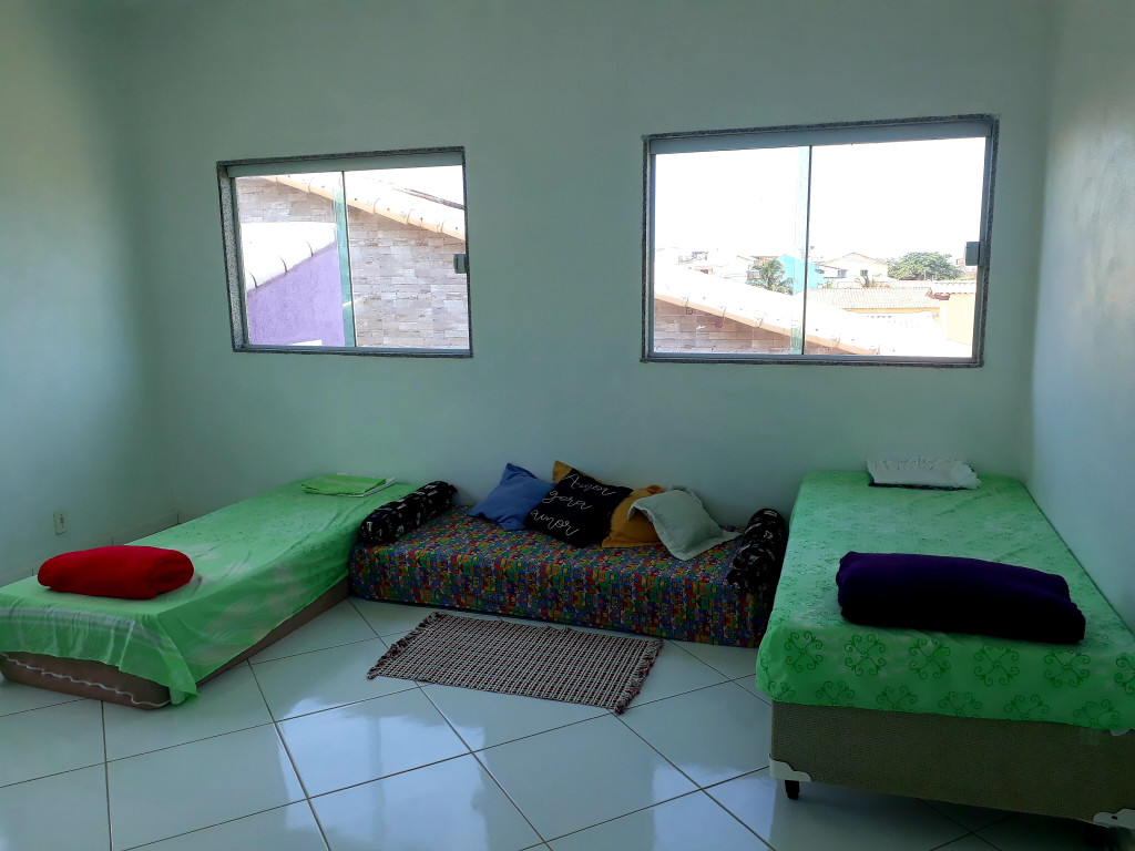 Segundo andar: um salão que vira quarto(1 cama de solteiro + 4 colchões), banheiro e um quarto com cama de casal. Máximo 8 pessoas pra ficar confortável.