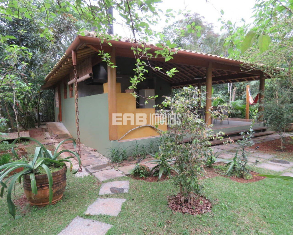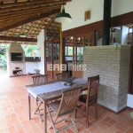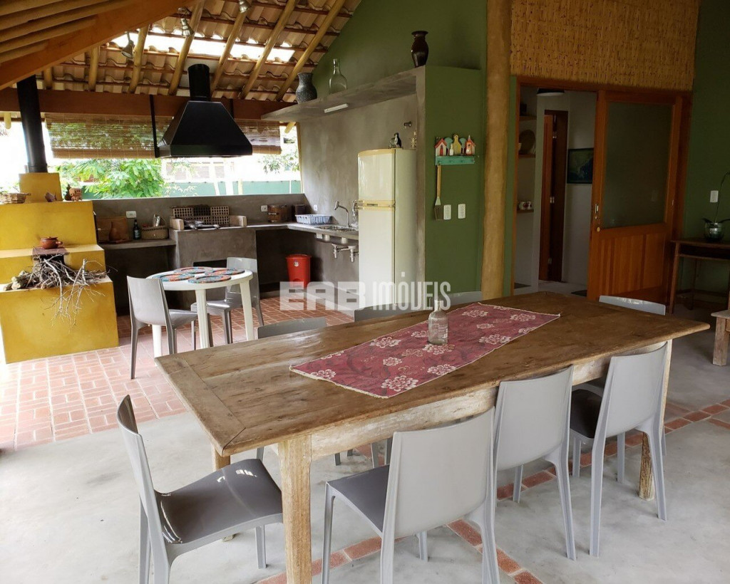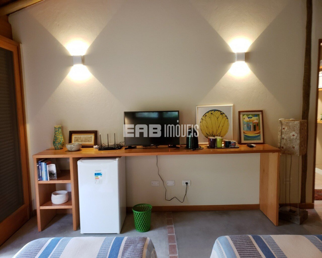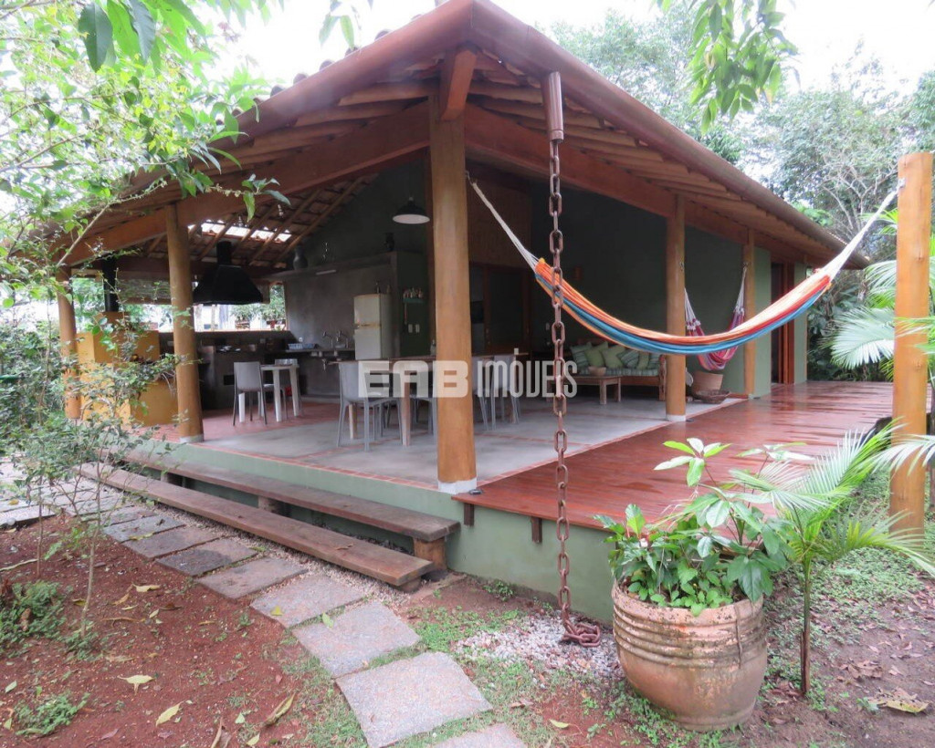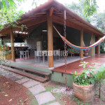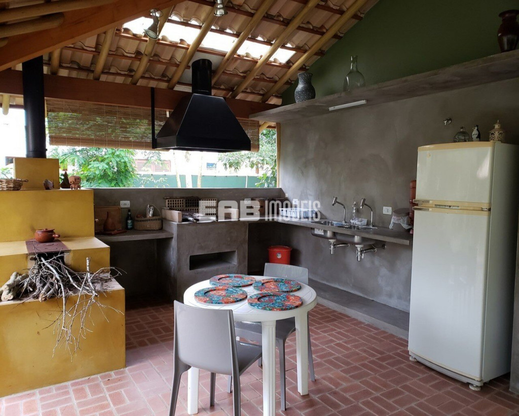 Lá fora, um amplo quiosque gourmet é um convite ao convívio. Elevado do solo, possui churrasqueira, fogão a lenha e forno de pizza. Ao lado, fica a suíte externa, num espaço muitíssimo agradável.