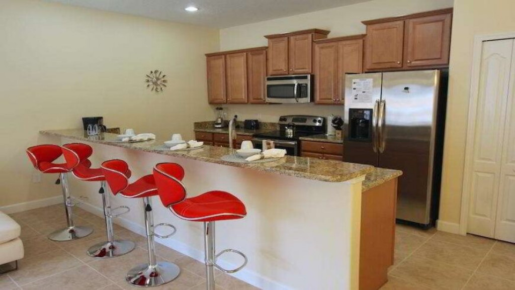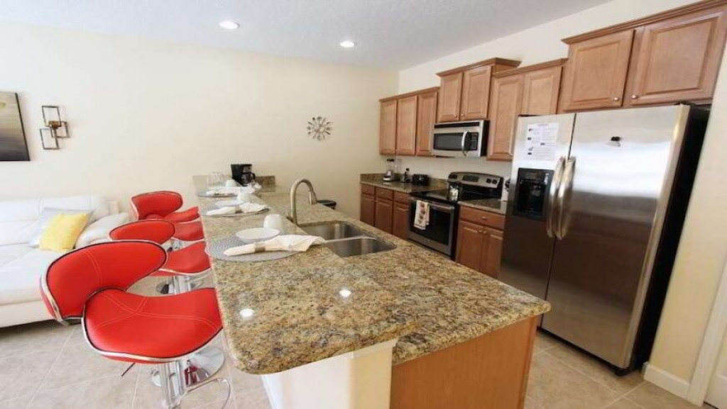 A cozinha americana, totalmente equipada com máquina de lavar pratos, micro-ondas, geladeira com freezer, fogão com forno, cafeteira, liquidificador etc, enfim todos os utensílios domésticos necessários.
