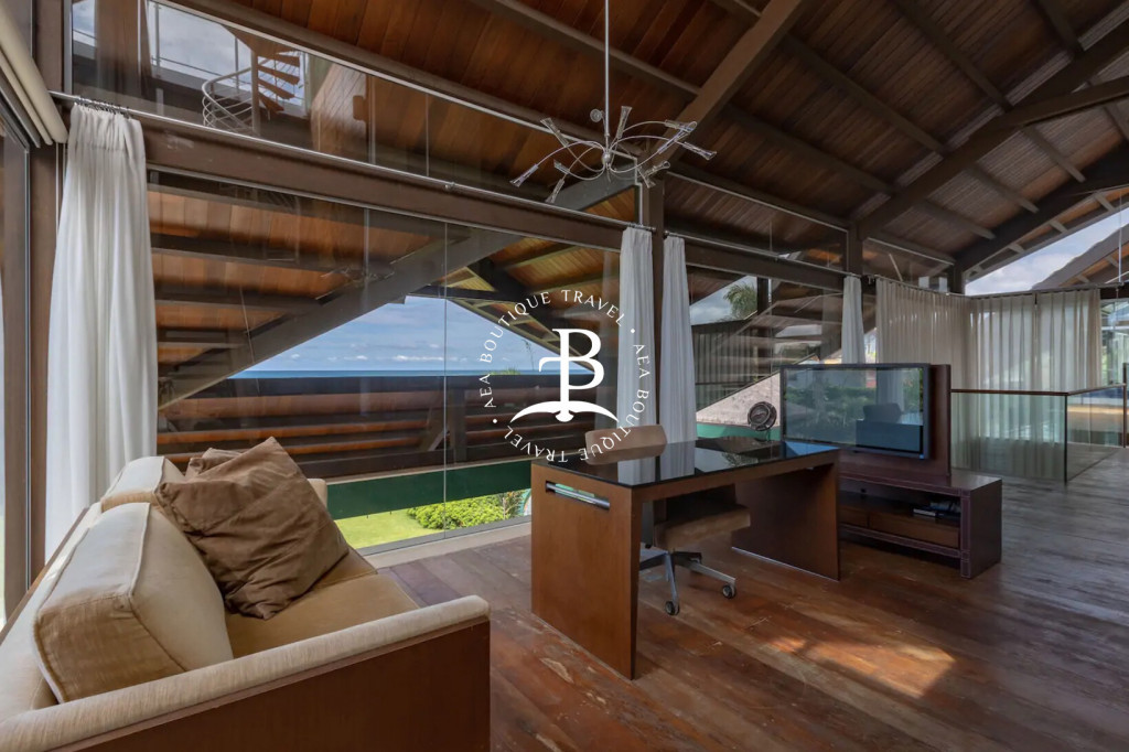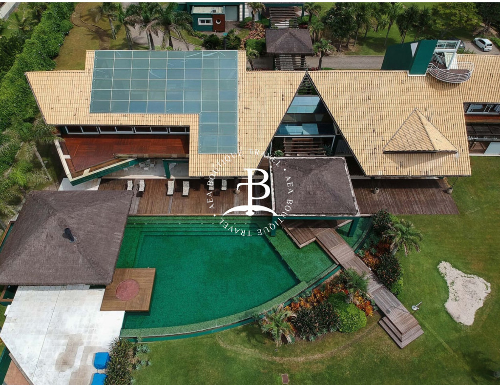 Há muita brasilidade na decoração: o luxo que remete às origens. Essa casa foi cuidadosamente mobiliada com decoração e ‘design’, cercada por um belo paisagismo e pela Mata Atlântica.