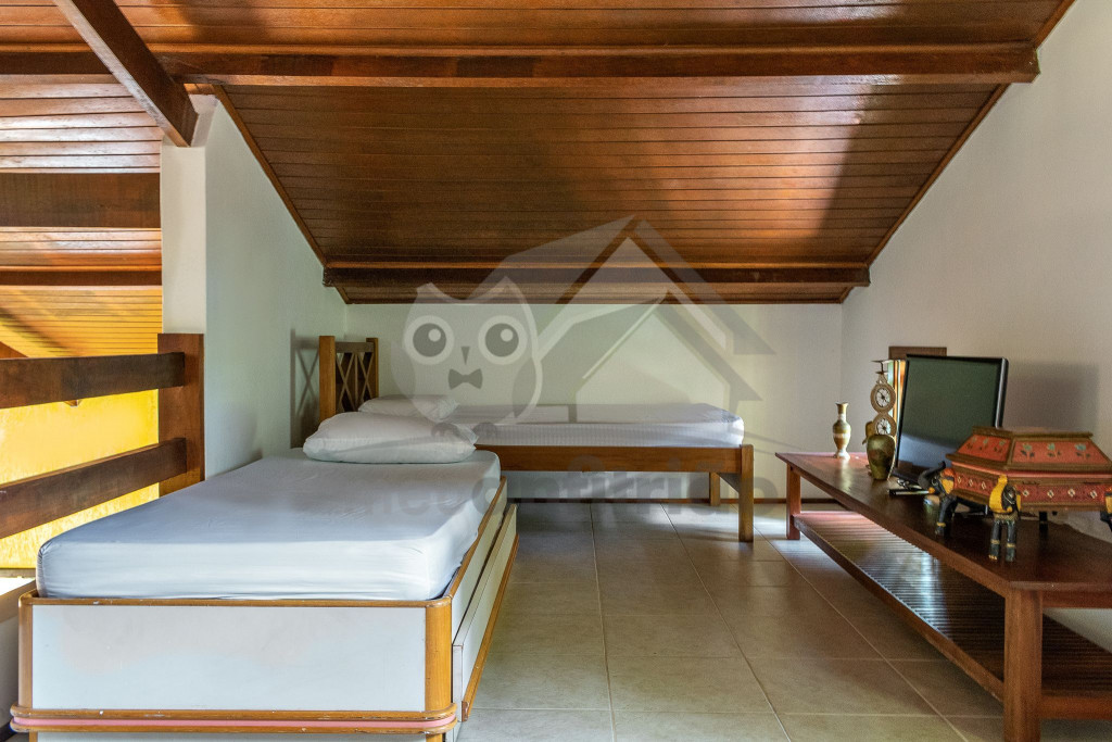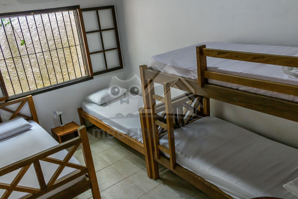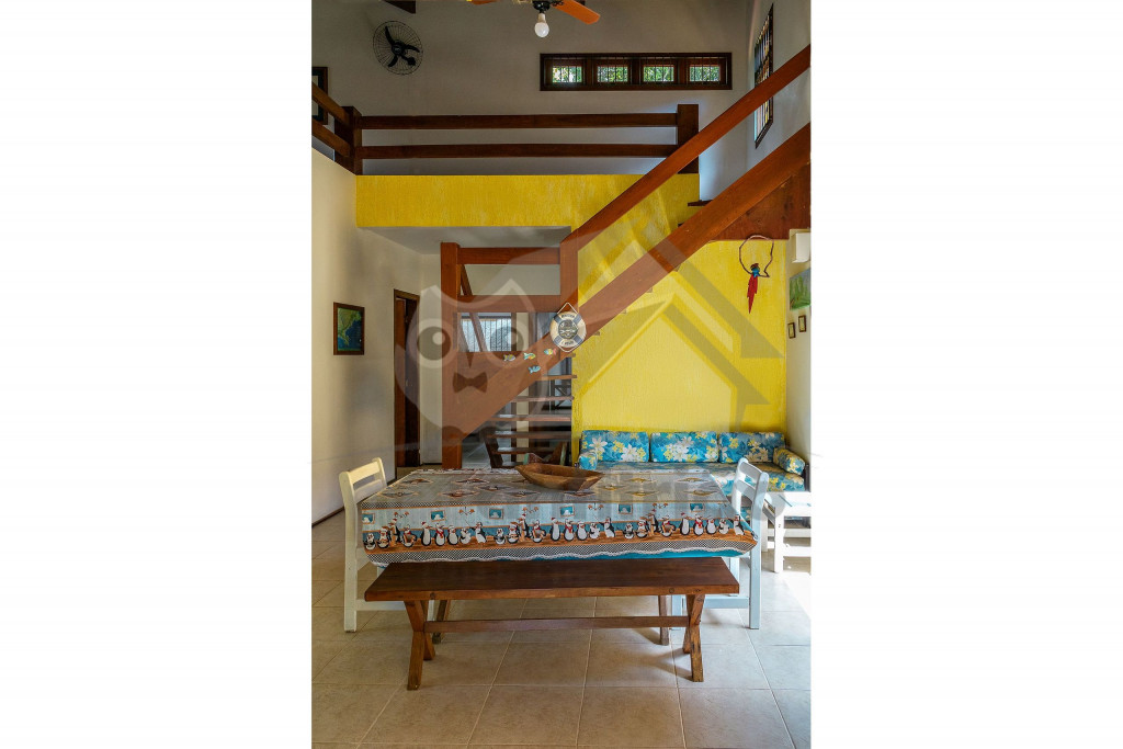 Bastante arejada e iluminada, o andar de baixo conta com uma sala com dois ambientes (estar e jantar), 2 quartos de casal, sendo 1 suíte, 1 quarto com 2 camas de solteiro e 1 beliche e um banheiro no corredor. Além disso, possui uma ampla cozinha open-space interligada com a sala, equipada com todos os utensílios necessários, duas geladeiras. Já o andar de cima conta com um mezanino com 1 cama de solteiro, 2 bicamas. Todos os quartos possuem ar condicionado e os ambientes comuns contam com ventiladores.